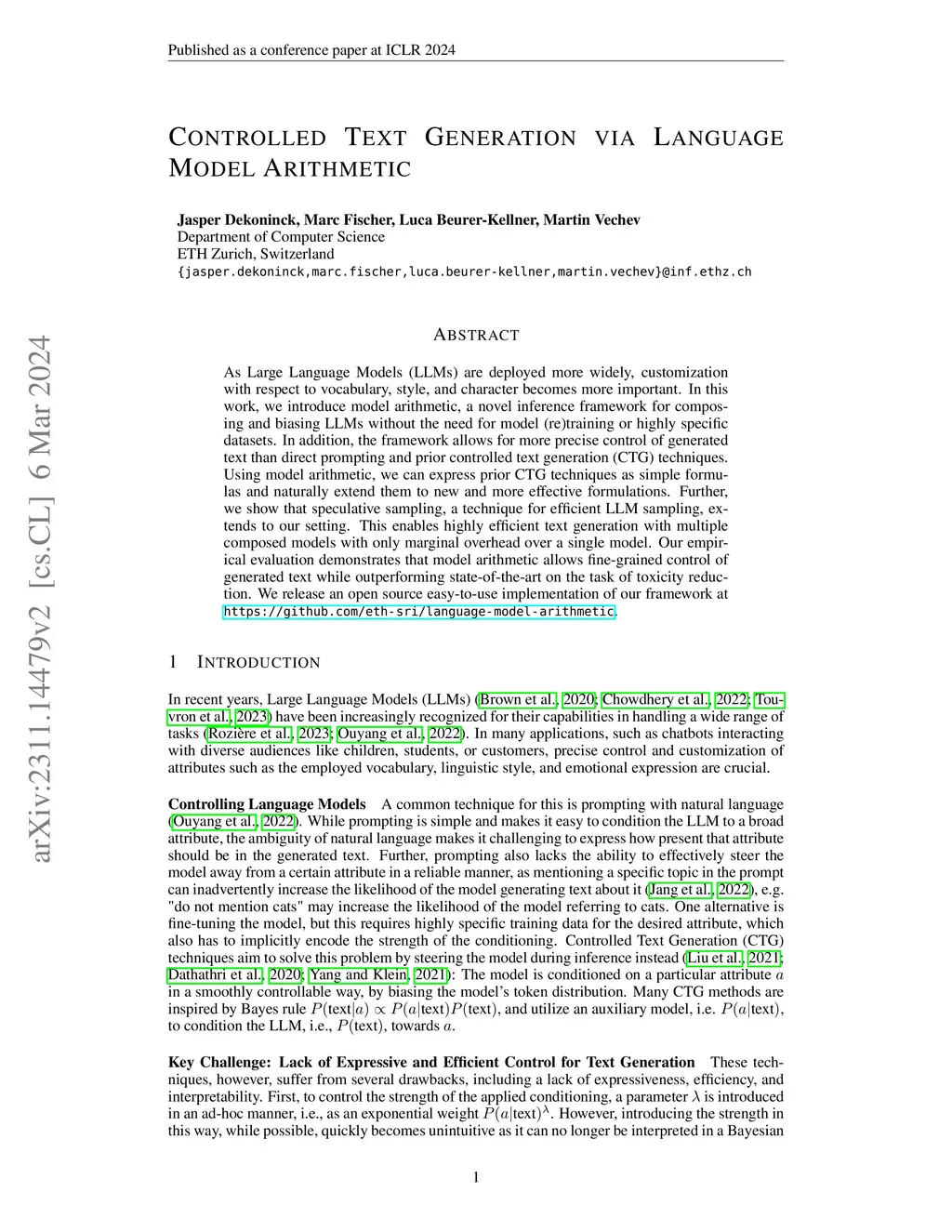 As Large Language Models (LLMs) are deployed more widely, customization with respect to vocabulary, style, and character becomes more important. In this work, we introduce model arithmetic, a novel inference framework for composing and biasing LLMs without the need for model (re)training or highly specific datasets. In addition, the framework allows for more precise control of generated text than direct prompting and prior controlled text generation (CTG) techniques. Using model arithmetic, we can express prior CTG techniques as simple formulas and naturally extend them to new and more effective formulations. Further, we show that speculative sampling, a technique for efficient LLM sampling, extends to our setting. This enables highly efficient text generation with multiple composed models with only marginal overhead over a single model. Our empirical evaluation demonstrates that model arithmetic allows fine-grained control of generated text while outperforming state-of-the-art on the task of toxicity reduction. We release an open source easy-to-use implementation of our framework at https://github.com/eth-sri/language-model-arithmetic.