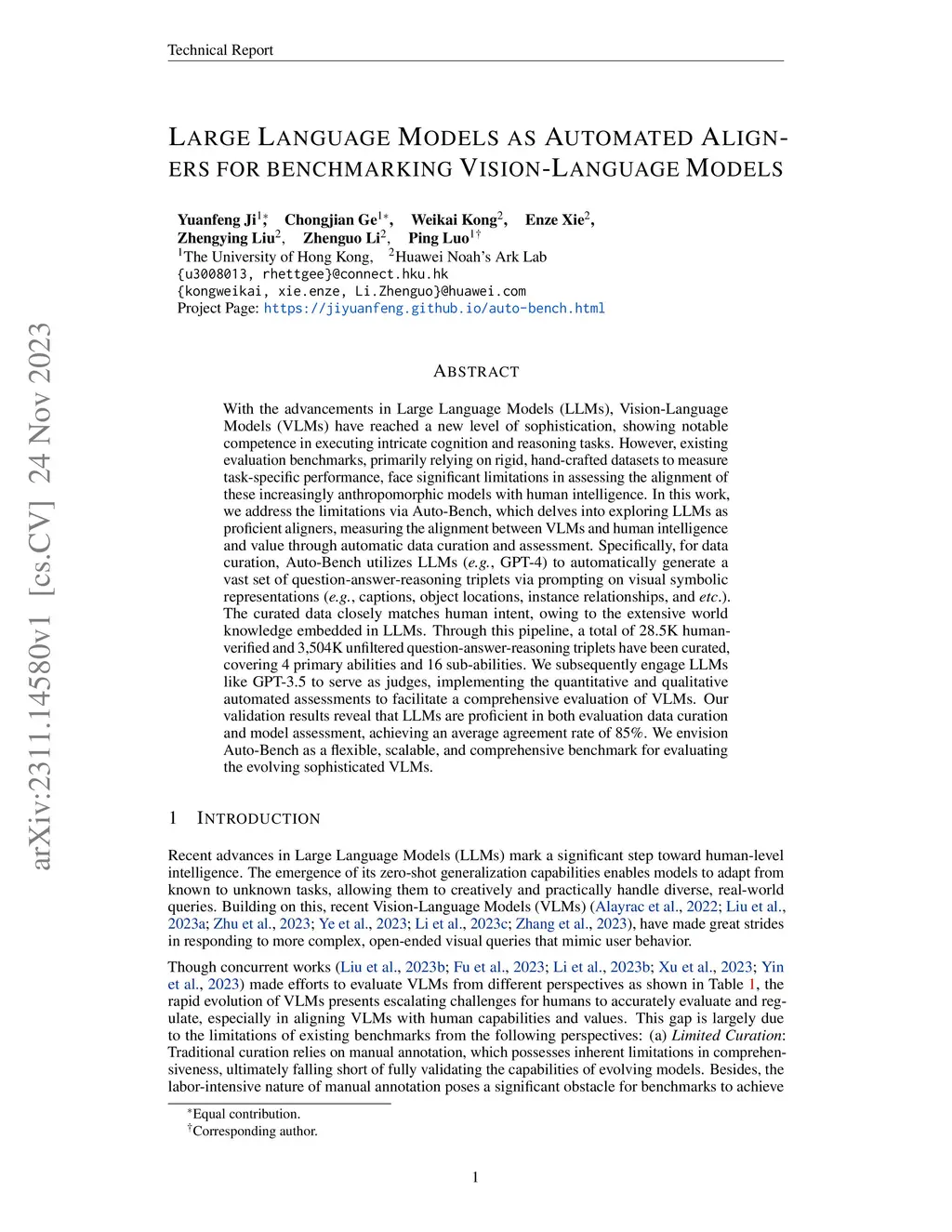 With the advancements in Large Language Models (LLMs), Vision-Language Models (VLMs) have reached a new level of sophistication, showing notable competence in executing intricate cognition and reasoning tasks. However, existing evaluation benchmarks, primarily relying on rigid, hand-crafted datasets to measure task-specific performance, face significant limitations in assessing the alignment of these increasingly anthropomorphic models with human intelligence. In this work, we address the limitations via Auto-Bench, which delves into exploring LLMs as proficient aligners, measuring the alignment between VLMs and human intelligence and value through automatic data curation and assessment. Specifically, for data curation, Auto-Bench utilizes LLMs (e.g., GPT-4) to automatically generate a vast set of question-answer-reasoning triplets via prompting on visual symbolic representations (e.g., captions, object locations, instance relationships, and etc.). The curated data closely matches human intent, owing to the extensive world knowledge embedded in LLMs. Through this pipeline, a total of 28.5K human-verified and 3,504K unfiltered question-answer-reasoning triplets have been curated, covering 4 primary abilities and 16 sub-abilities. We subsequently engage LLMs like GPT-3.5 to serve as judges, implementing the quantitative and qualitative automated assessments to facilitate a comprehensive evaluation of VLMs. Our validation results reveal that LLMs are proficient in both evaluation data curation and model assessment, achieving an average agreement rate of 85%. We envision Auto-Bench as a flexible, scalable, and comprehensive benchmark for evaluating the evolving sophisticated VLMs.