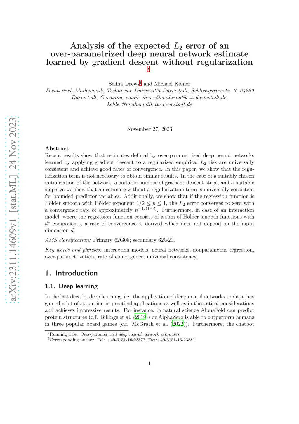 Recent results show that estimates defined by over-parametrized deep neural networks learned by applying gradient descent to a regularized empirical risk are universally consistent and achieve good rates of convergence. In this paper, we show that the regularization term is not necessary to obtain similar results. In the case of a suitably chosen initialization of the network, a suitable number of gradient descent steps, and a suitable step size we show that an estimate without a regularization term is universally consistent for bounded predictor variables. Additionally, we show that if the regression function is H\"older smooth with H\"older exponent , the error converges to zero with a convergence rate of approximately . Furthermore, in case of an interaction model, where the regression function consists of a sum of H\"older smooth functions with components, a rate of convergence is derived which does not depend on the input dimension .