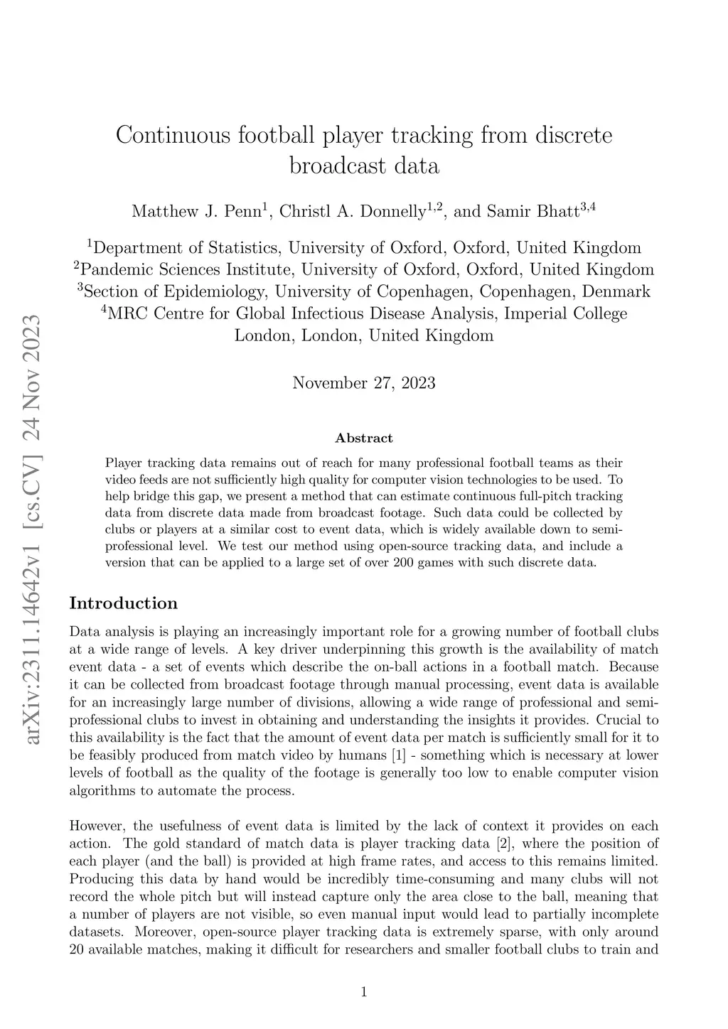 Continuous football player tracking from discrete broadcast data