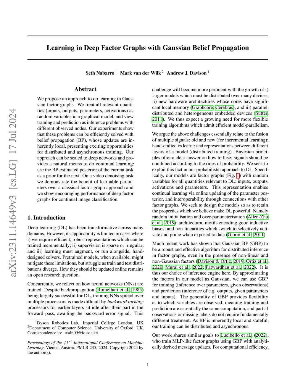 We propose an approach to do learning in Gaussian factor graphs. We treat all relevant quantities (inputs, outputs, parameters, latents) as random variables in a graphical model, and view both training and prediction as inference problems with different observed nodes. Our experiments show that these problems can be efficiently solved with belief propagation (BP), whose updates are inherently local, presenting exciting opportunities for distributed and asynchronous training. Our approach can be scaled to deep networks and provides a natural means to do continual learning: use the BP-estimated parameter marginals of the current task as parameter priors for the next. On a video denoising task we demonstrate the benefit of learnable parameters over a classical factor graph approach and we show encouraging performance of deep factor graphs for continual image classification.