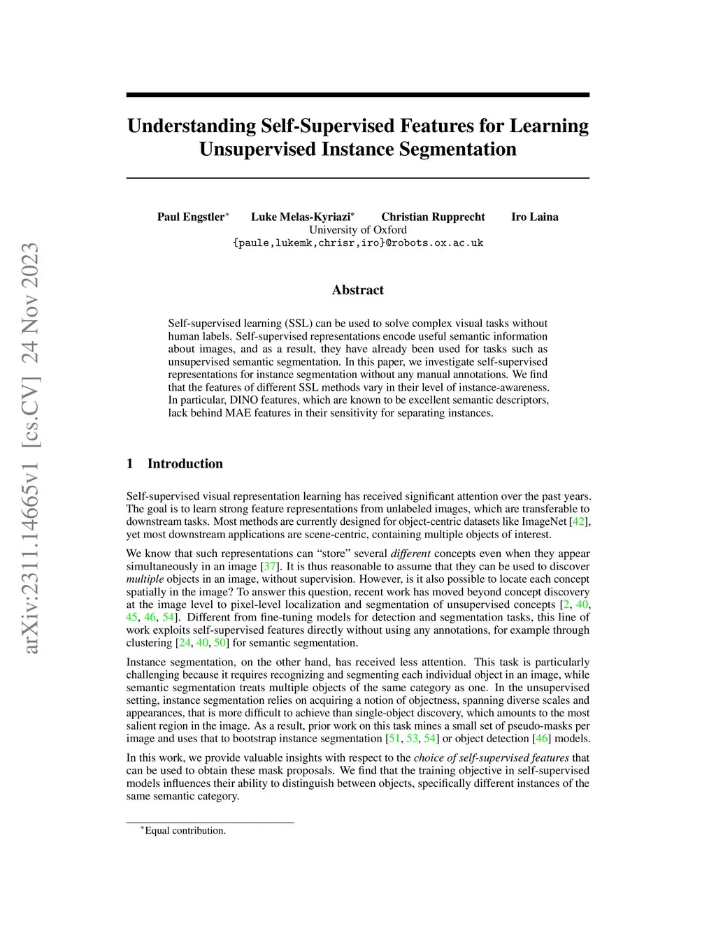 Self-supervised learning (SSL) can be used to solve complex visual tasks without human labels. Self-supervised representations encode useful semantic information about images, and as a result, they have already been used for tasks such as unsupervised semantic segmentation. In this paper, we investigate self-supervised representations for instance segmentation without any manual annotations. We find that the features of different SSL methods vary in their level of instance-awareness. In particular, DINO features, which are known to be excellent semantic descriptors, lack behind MAE features in their sensitivity for separating instances.