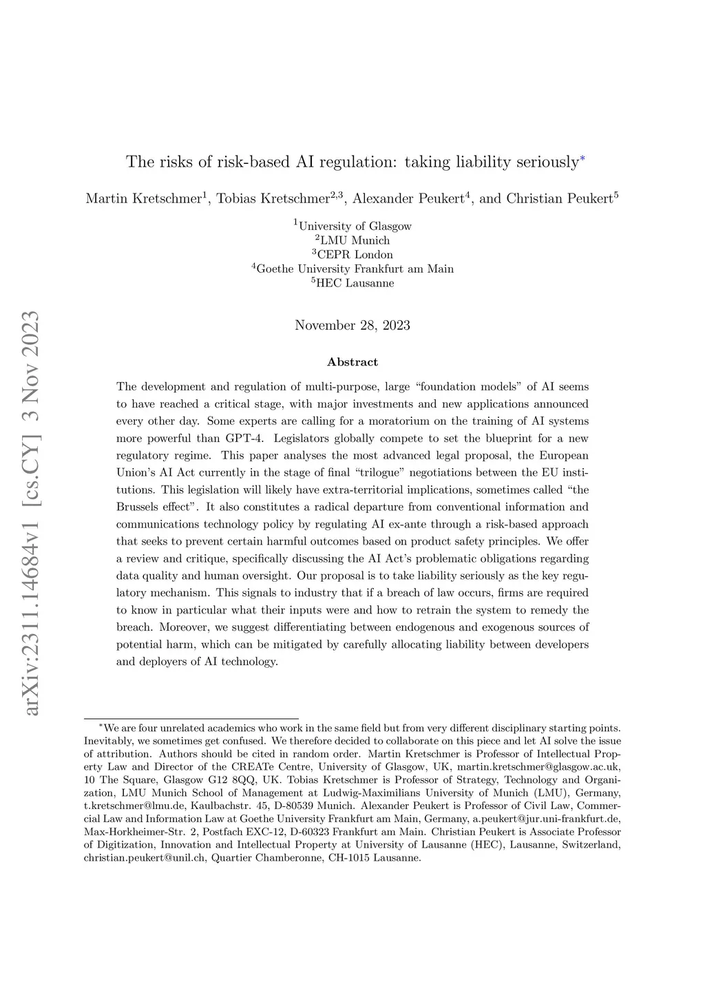 The development and regulation of multi-purpose, large "foundation models" of AI seems to have reached a critical stage, with major investments and new applications announced every other day. Some experts are calling for a moratorium on the training of AI systems more powerful than GPT-4. Legislators globally compete to set the blueprint for a new regulatory regime. This paper analyses the most advanced legal proposal, the European Union's AI Act currently in the stage of final "trilogue" negotiations between the EU institutions. This legislation will likely have extra-territorial implications, sometimes called "the Brussels effect". It also constitutes a radical departure from conventional information and communications technology policy by regulating AI ex-ante through a risk-based approach that seeks to prevent certain harmful outcomes based on product safety principles. We offer a review and critique, specifically discussing the AI Act's problematic obligations regarding data quality and human oversight. Our proposal is to take liability seriously as the key regulatory mechanism. This signals to industry that if a breach of law occurs, firms are required to know in particular what their inputs were and how to retrain the system to remedy the breach. Moreover, we suggest differentiating between endogenous and exogenous sources of potential harm, which can be mitigated by carefully allocating liability between developers and deployers of AI technology.