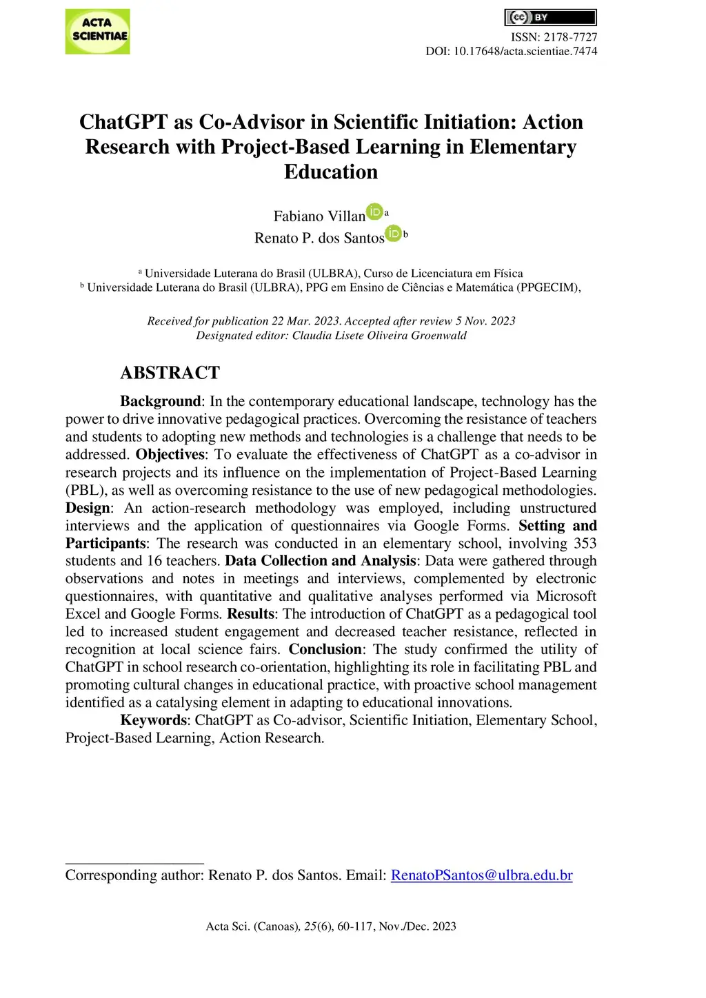 Background: In the contemporary educational landscape, technology has the power to drive innovative pedagogical practices. Overcoming the resistance of teachers and students to adopting new methods and technologies is a challenge that needs to be addressed. Objectives: To evaluate the effectiveness of ChatGPT as a co-advisor in research projects and its influence on the implementation of Project-Based Learning (PBL), as well as overcoming resistance to the use of new pedagogical methodologies. Design: An action-research methodology was employed, including unstructured interviews and the application of questionnaires via Google Forms. Setting and Participants: The research was conducted in an elementary school, involving 353 students and 16 teachers. Data Collection and Analysis: Data were gathered through observations and notes in meetings and interviews, complemented by electronic questionnaires, with quantitative and qualitative analyses performed via Microsoft Excel and Google Forms. Results: The introduction of ChatGPT as a pedagogical tool led to increased student engagement and decreased teacher resistance, reflected in recognition at local science fairs. Conclusion: The study confirmed the utility of ChatGPT in school research co-orientation, highlighting its role in facilitating PBL and promoting cultural changes in educational practice, with proactive school management identified as a catalysing element in adapting to educational innovations.
