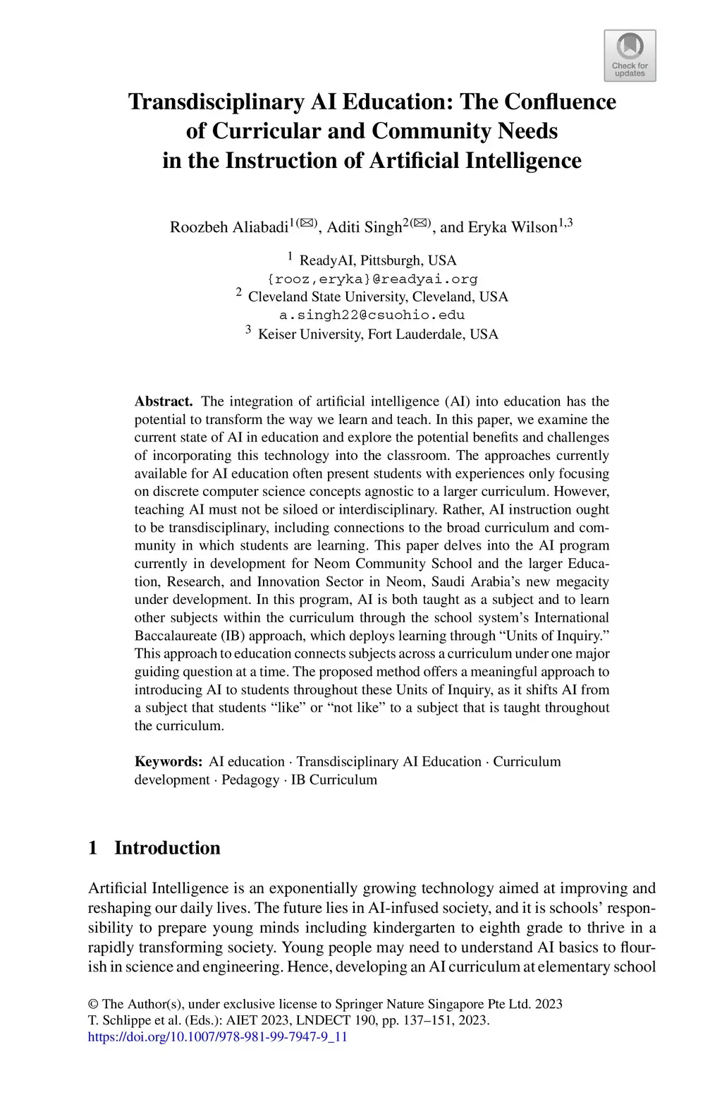 The integration of artificial intelligence (AI) into education has the potential to transform the way we learn and teach. In this paper, we examine the current state of AI in education and explore the potential benefits and challenges of incorporating this technology into the classroom. The approaches currently available for AI education often present students with experiences only focusing on discrete computer science concepts agnostic to a larger curriculum. However, teaching AI must not be siloed or interdisciplinary. Rather, AI instruction ought to be transdisciplinary, including connections to the broad curriculum and community in which students are learning. This paper delves into the AI program currently in development for Neom Community School and the larger Education, Research, and Innovation Sector in Neom, Saudi Arabia s new megacity under development. In this program, AI is both taught as a subject and to learn other subjects within the curriculum through the school systems International Baccalaureate (IB) approach, which deploys learning through Units of Inquiry. This approach to education connects subjects across a curriculum under one major guiding question at a time. The proposed method offers a meaningful approach to introducing AI to students throughout these Units of Inquiry, as it shifts AI from a subject that students like or not like to a subject that is taught throughout the curriculum.