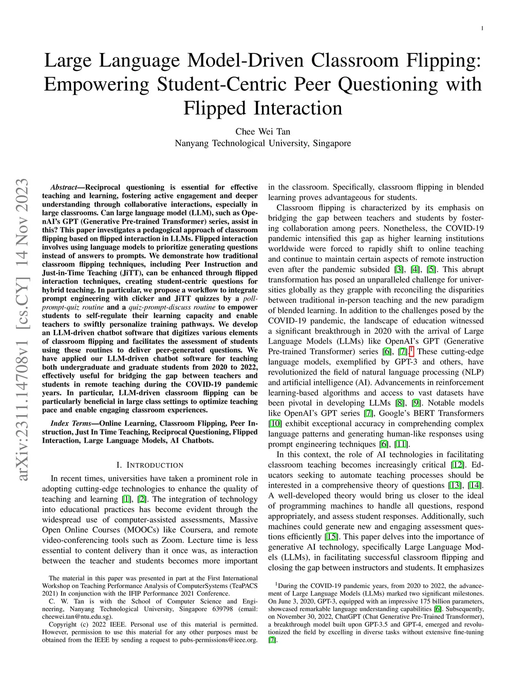 Reciprocal questioning is essential for effective teaching and learning, fostering active engagement and deeper understanding through collaborative interactions, especially in large classrooms. Can large language model (LLM), such as OpenAI's GPT (Generative Pre-trained Transformer) series, assist in this? This paper investigates a pedagogical approach of classroom flipping based on flipped interaction in LLMs. Flipped interaction involves using language models to prioritize generating questions instead of answers to prompts. We demonstrate how traditional classroom flipping techniques, including Peer Instruction and Just-in-Time Teaching (JiTT), can be enhanced through flipped interaction techniques, creating student-centric questions for hybrid teaching. In particular, we propose a workflow to integrate prompt engineering with clicker and JiTT quizzes by a poll-prompt-quiz routine and a quiz-prompt-discuss routine to empower students to self-regulate their learning capacity and enable teachers to swiftly personalize training pathways. We develop an LLM-driven chatbot software that digitizes various elements of classroom flipping and facilitates the assessment of students using these routines to deliver peer-generated questions. We have applied our LLM-driven chatbot software for teaching both undergraduate and graduate students from 2020 to 2022, effectively useful for bridging the gap between teachers and students in remote teaching during the COVID-19 pandemic years. In particular, LLM-driven classroom flipping can be particularly beneficial in large class settings to optimize teaching pace and enable engaging classroom experiences.