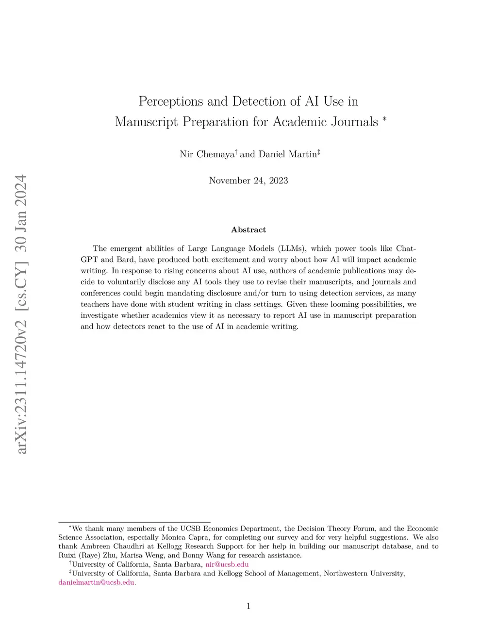 The emergent abilities of Large Language Models (LLMs), which power tools like ChatGPT and Bard, have produced both excitement and worry about how AI will impact academic writing. In response to rising concerns about AI use, authors of academic publications may decide to voluntarily disclose any AI tools they use to revise their manuscripts, and journals and conferences could begin mandating disclosure and/or turn to using detection services, as many teachers have done with student writing in class settings. Given these looming possibilities, we investigate whether academics view it as necessary to report AI use in manuscript preparation and how detectors react to the use of AI in academic writing.