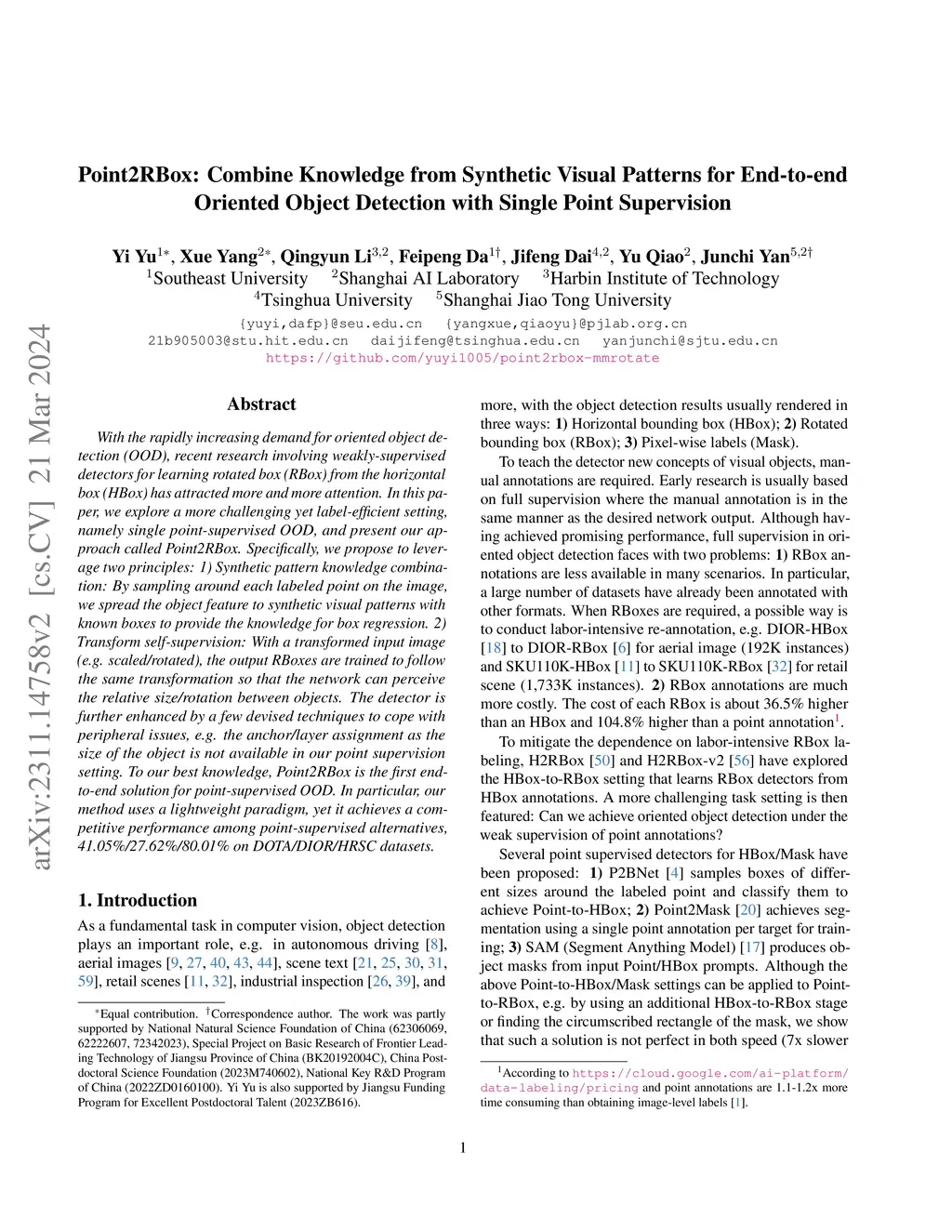 Point2RBox: Combine Knowledge from Synthetic Visual Patterns for