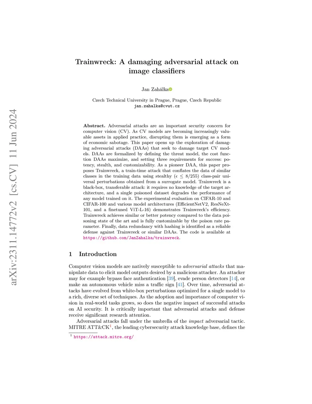 Adversarial attacks are an important security concern for computer vision (CV). As CV models are becoming increasingly valuable assets in applied practice, disrupting them is emerging as a form of economic sabotage. This paper opens up the exploration of damaging adversarial attacks (DAAs) that seek to damage target CV models. DAAs are formalized by defining the threat model, the cost function DAAs maximize, and setting three requirements for success: potency, stealth, and customizability. As a pioneer DAA, this paper proposes Trainwreck, a train-time attack that conflates the data of similar classes in the training data using stealthy () class-pair universal perturbations obtained from a surrogate model. Trainwreck is a black-box, transferable attack: it requires no knowledge of the target architecture, and a single poisoned dataset degrades the performance of any model trained on it. The experimental evaluation on CIFAR-10 and CIFAR-100 and various model architectures (EfficientNetV2, ResNeXt-101, and a finetuned ViT-L-16) demonstrates Trainwreck's efficiency. Trainwreck achieves similar or better potency compared to the data poisoning state of the art and is fully customizable by the poison rate parameter. Finally, data redundancy with hashing is identified as a reliable defense against Trainwreck or similar DAAs. The code is available at https://github.com/JanZahalka/trainwreck.