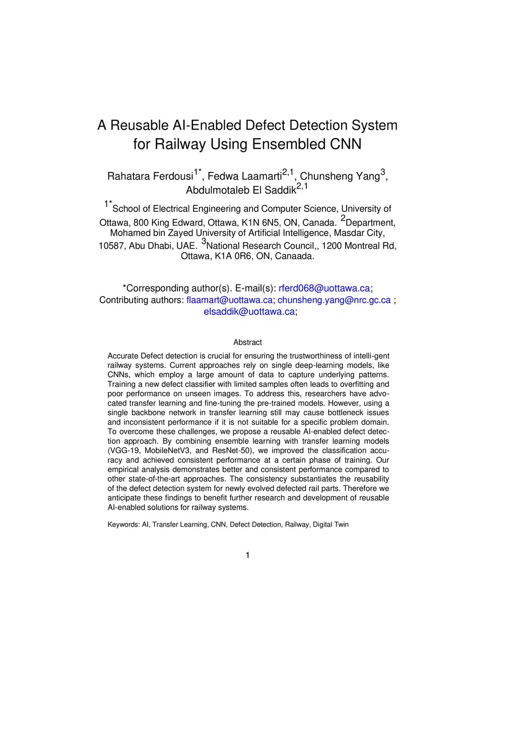 Accurate Defect detection is crucial for ensuring the trustworthiness of intelligent railway systems. Current approaches rely on single deep-learning models, like CNNs, which employ a large amount of data to capture underlying patterns. Training a new defect classifier with limited samples often leads to overfitting and poor performance on unseen images. To address this, researchers have advocated transfer learning and fine-tuning the pre-trained models. However, using a single backbone network in transfer learning still may cause bottleneck issues and inconsistent performance if it is not suitable for a specific problem domain. To overcome these challenges, we propose a reusable AI-enabled defect detection approach. By combining ensemble learning with transfer learning models (VGG-19, MobileNetV3, and ResNet-50), we improved the classification accuracy and achieved consistent performance at a certain phase of training. Our empirical analysis demonstrates better and more consistent performance compared to other state-of-the-art approaches. The consistency substantiates the reusability of the defect detection system for newly evolved defected rail parts. Therefore we anticipate these findings to benefit further research and development of reusable AI-enabled solutions for railway systems.