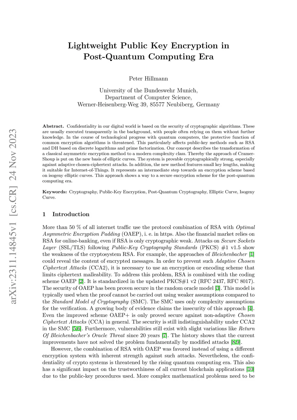 Confidentiality in our digital world is based on the security of cryptographic algorithms. These are usually executed transparently in the background, with people often relying on them without further knowledge. In the course of technological progress with quantum computers, the protective function of common encryption algorithms is threatened. This particularly affects public-key methods such as RSA and DH based on discrete logarithms and prime factorization. Our concept describes the transformation of a classical asymmetric encryption method to a modern complexity class. Thereby the approach of Cramer-Shoup is put on the new basis of elliptic curves. The system is provable cryptographically strong, especially against adaptive chosen-ciphertext attacks. In addition, the new method features small key lengths, making it suitable for Internet-of-Things. It represents an intermediate step towards an encryption scheme based on isogeny elliptic curves. This approach shows a way to a secure encryption scheme for the post-quantum computing era.