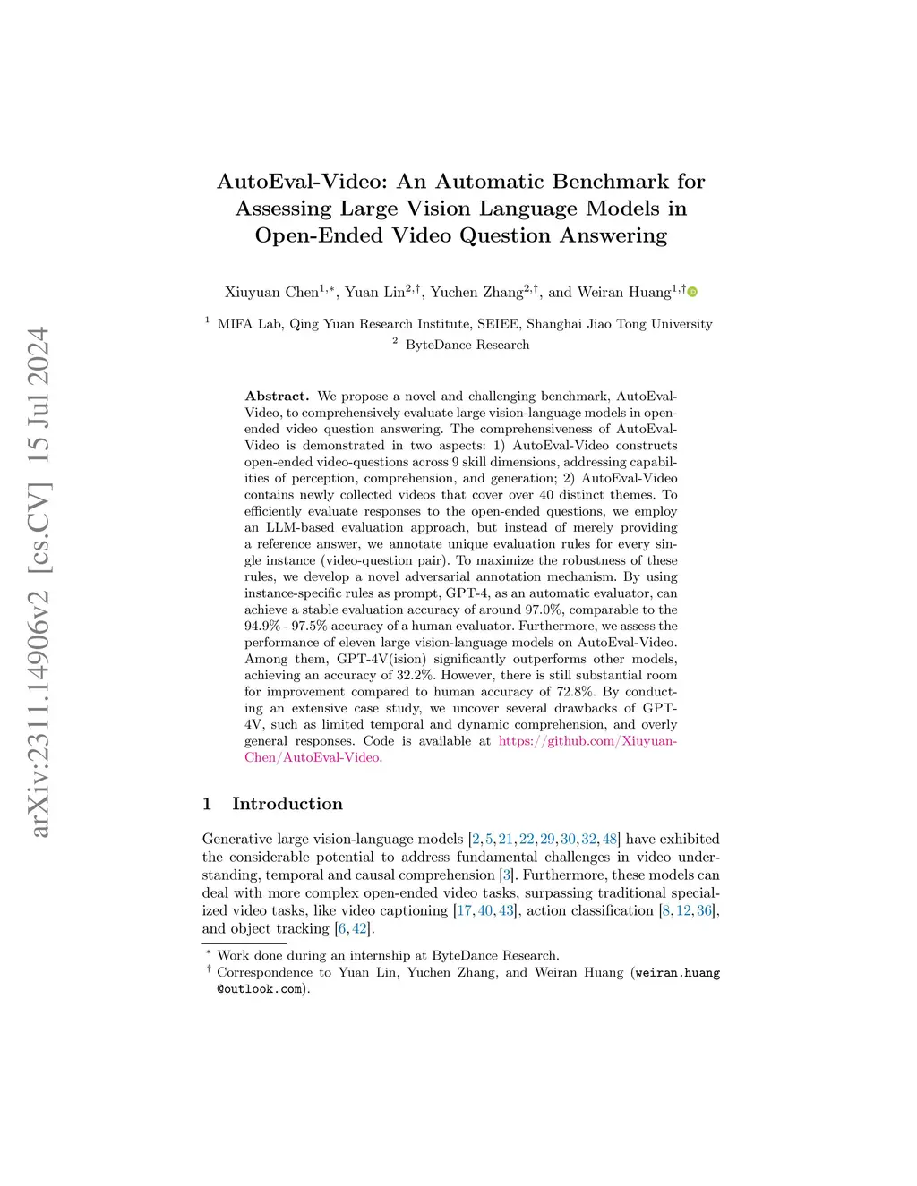 AutoEval-Video: An Automatic Benchmark for Assessing Large Vision