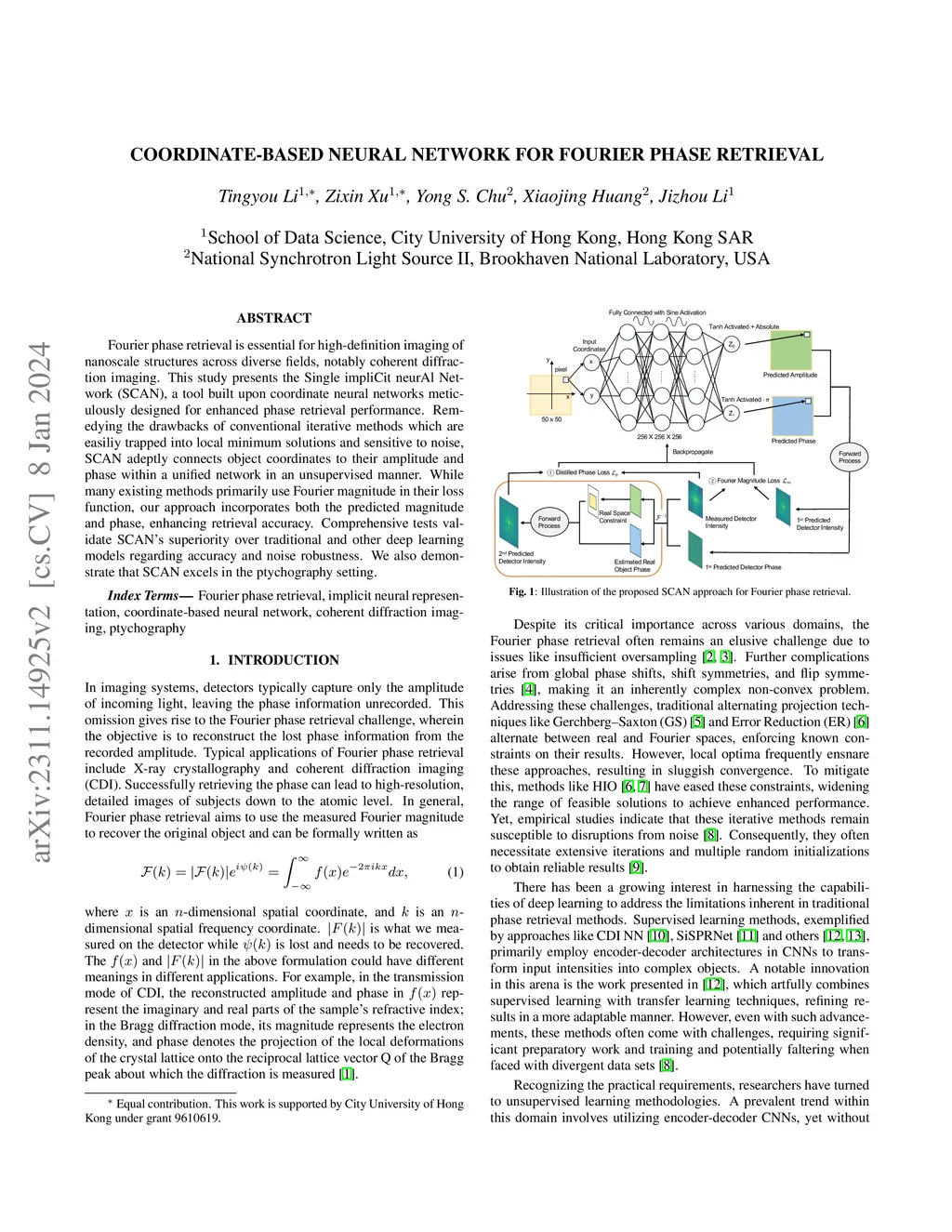 Fourier phase retrieval is essential for high-definition imaging of nanoscale structures across diverse fields, notably coherent diffraction imaging. This study presents the Single impliCit neurAl Network (SCAN), a tool built upon coordinate neural networks meticulously designed for enhanced phase retrieval performance. Remedying the drawbacks of conventional iterative methods which are easiliy trapped into local minimum solutions and sensitive to noise, SCAN adeptly connects object coordinates to their amplitude and phase within a unified network in an unsupervised manner. While many existing methods primarily use Fourier magnitude in their loss function, our approach incorporates both the predicted magnitude and phase, enhancing retrieval accuracy. Comprehensive tests validate SCAN's superiority over traditional and other deep learning models regarding accuracy and noise robustness. We also demonstrate that SCAN excels in the ptychography setting.