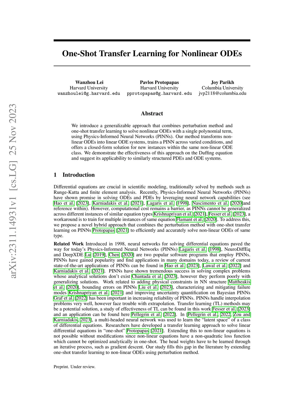 We introduce a generalizable approach that combines perturbation method and one-shot transfer learning to solve nonlinear ODEs with a single polynomial term, using Physics-Informed Neural Networks (PINNs). Our method transforms non-linear ODEs into linear ODE systems, trains a PINN across varied conditions, and offers a closed-form solution for new instances within the same non-linear ODE class. We demonstrate the effectiveness of this approach on the Duffing equation and suggest its applicability to similarly structured PDEs and ODE systems.