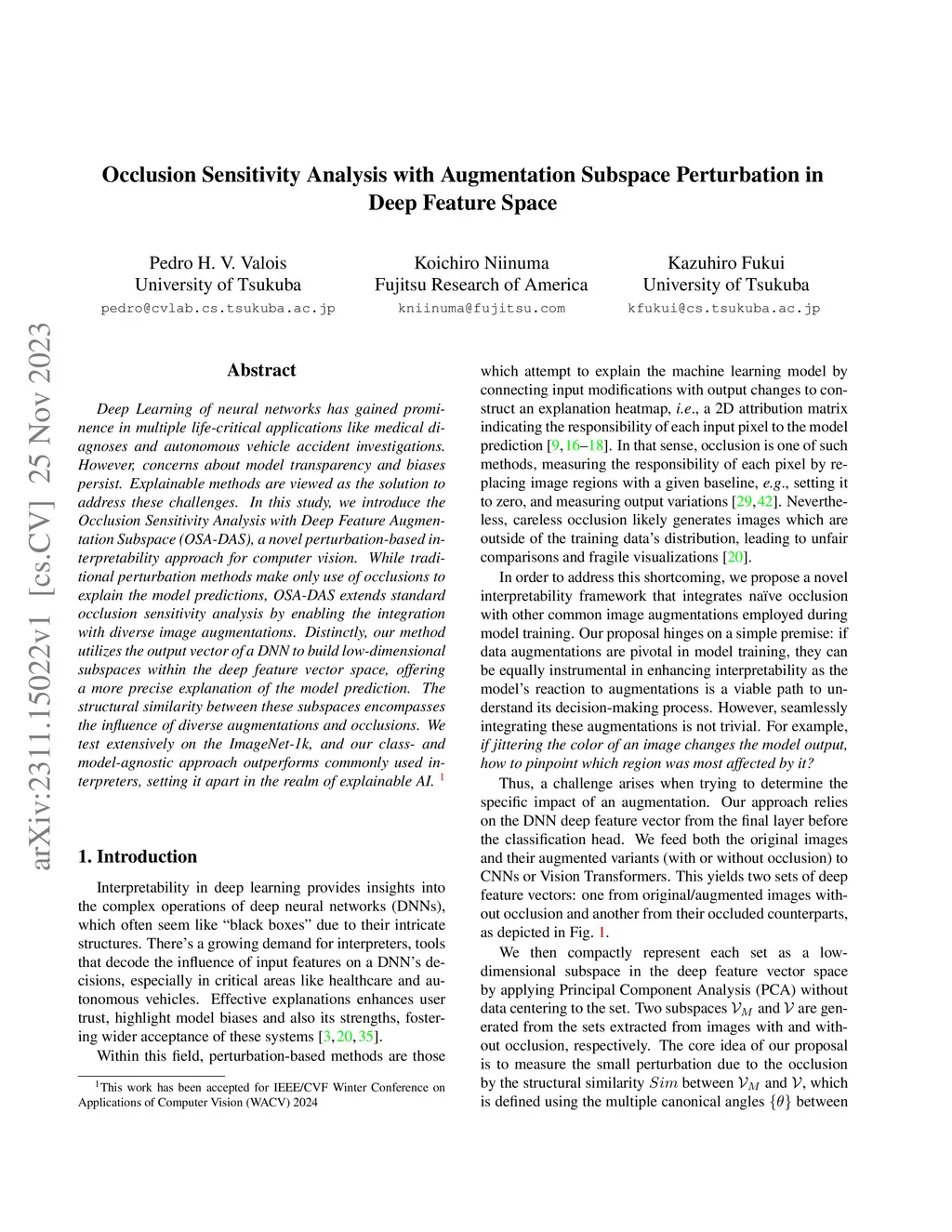 Deep Learning of neural networks has gained prominence in multiple life-critical applications like medical diagnoses and autonomous vehicle accident investigations. However, concerns about model transparency and biases persist. Explainable methods are viewed as the solution to address these challenges. In this study, we introduce the Occlusion Sensitivity Analysis with Deep Feature Augmentation Subspace (OSA-DAS), a novel perturbation-based interpretability approach for computer vision. While traditional perturbation methods make only use of occlusions to explain the model predictions, OSA-DAS extends standard occlusion sensitivity analysis by enabling the integration with diverse image augmentations. Distinctly, our method utilizes the output vector of a DNN to build low-dimensional subspaces within the deep feature vector space, offering a more precise explanation of the model prediction. The structural similarity between these subspaces encompasses the influence of diverse augmentations and occlusions. We test extensively on the ImageNet-1k, and our class- and model-agnostic approach outperforms commonly used interpreters, setting it apart in the realm of explainable AI.