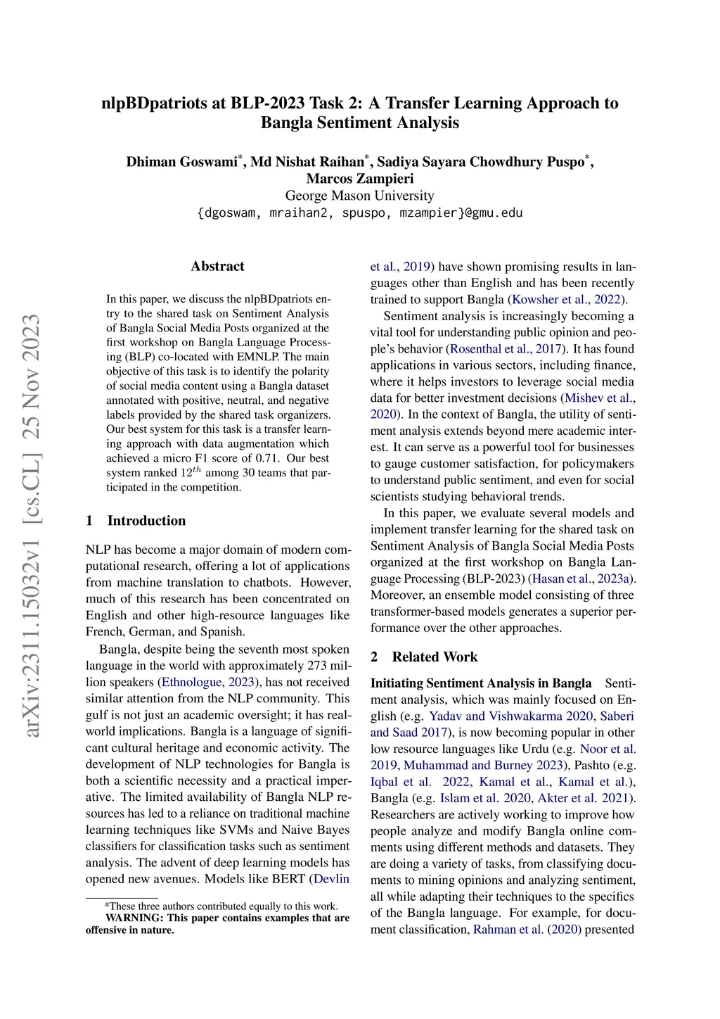 nlpBDpatriots at BLP-2023 Task 2: A Transfer Learning Approach to Bangla