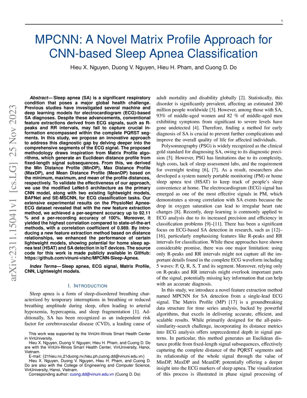 MPCNN: A Novel Matrix Profile Approach for CNN-based Sleep Apnea