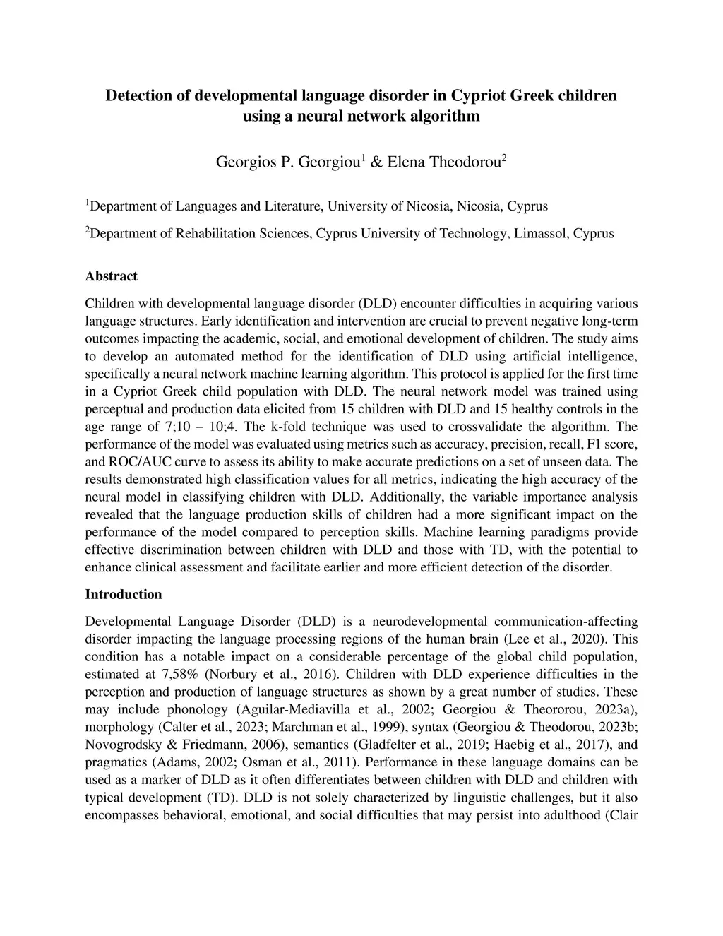 Children with developmental language disorder (DLD) encounter difficulties in acquiring various language structures. Early identification and intervention are crucial to prevent negative long-term outcomes impacting the academic, social, and emotional development of children. The study aims to develop an automated method for the identification of DLD using artificial intelligence, specifically a neural network machine learning algorithm. This protocol is applied for the first time in a Cypriot Greek child population with DLD. The neural network model was trained using perceptual and production data elicited from 15 children with DLD and 15 healthy controls in the age range of 7;10 until 10;4. The k-fold technique was used to crossvalidate the algorithm. The performance of the model was evaluated using metrics such as accuracy, precision, recall, F1 score, and ROC/AUC curve to assess its ability to make accurate predictions on a set of unseen data. The results demonstrated high classification values for all metrics, indicating the high accuracy of the neural model in classifying children with DLD. Additionally, the variable importance analysis revealed that the language production skills of children had a more significant impact on the performance of the model compared to perception skills. Machine learning paradigms provide effective discrimination between children with DLD and those with TD, with the potential to enhance clinical assessment and facilitate earlier and more efficient detection of the disorder.