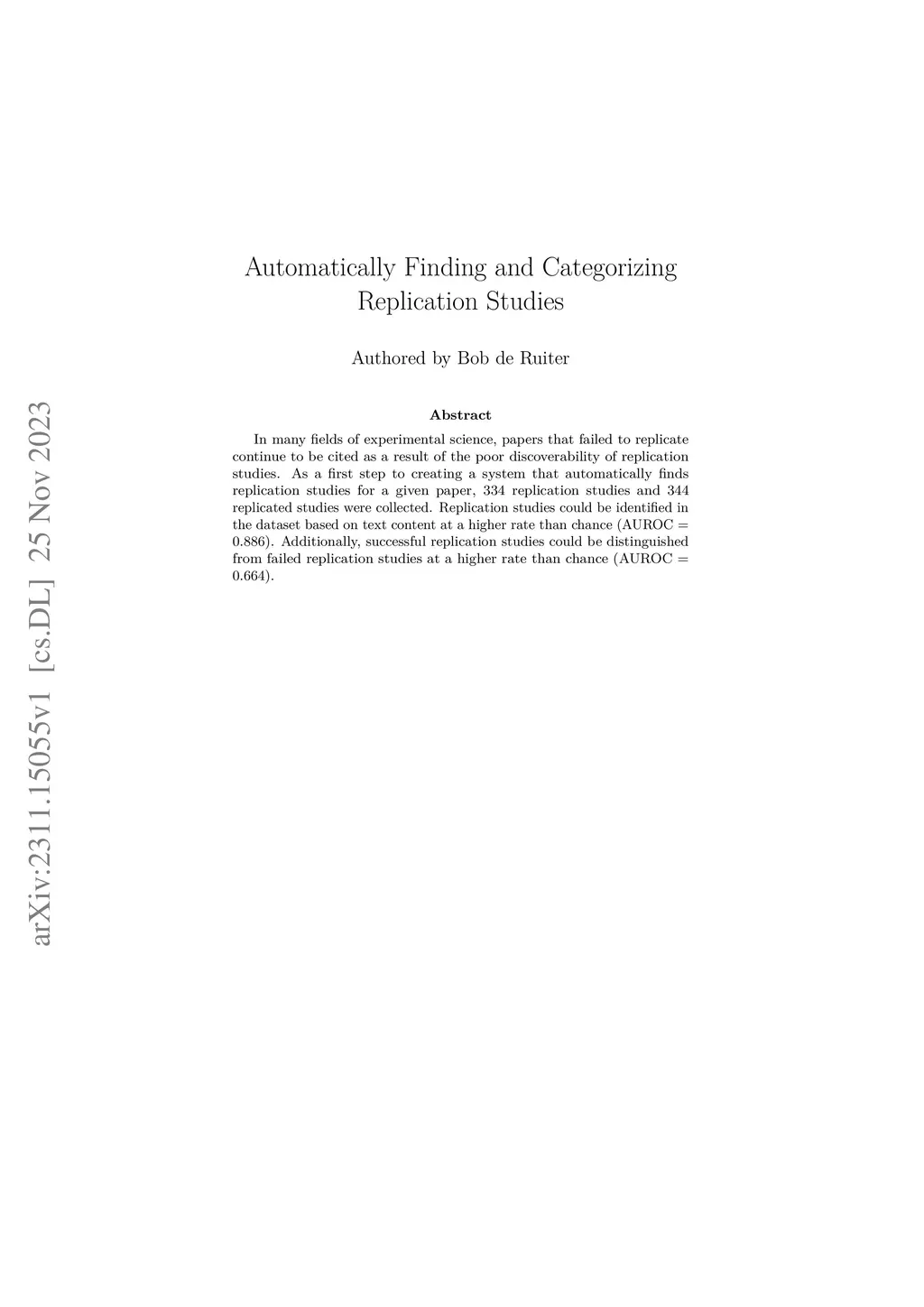 In many fields of experimental science, papers that failed to replicate continue to be cited as a result of the poor discoverability of replication studies. As a first step to creating a system that automatically finds replication studies for a given paper, 334 replication studies and 344 replicated studies were collected. Replication studies could be identified in the dataset based on text content at a higher rate than chance (AUROC = 0.886). Additionally, successful replication studies could be distinguished from failed replication studies at a higher rate than chance (AUROC = 0.664).