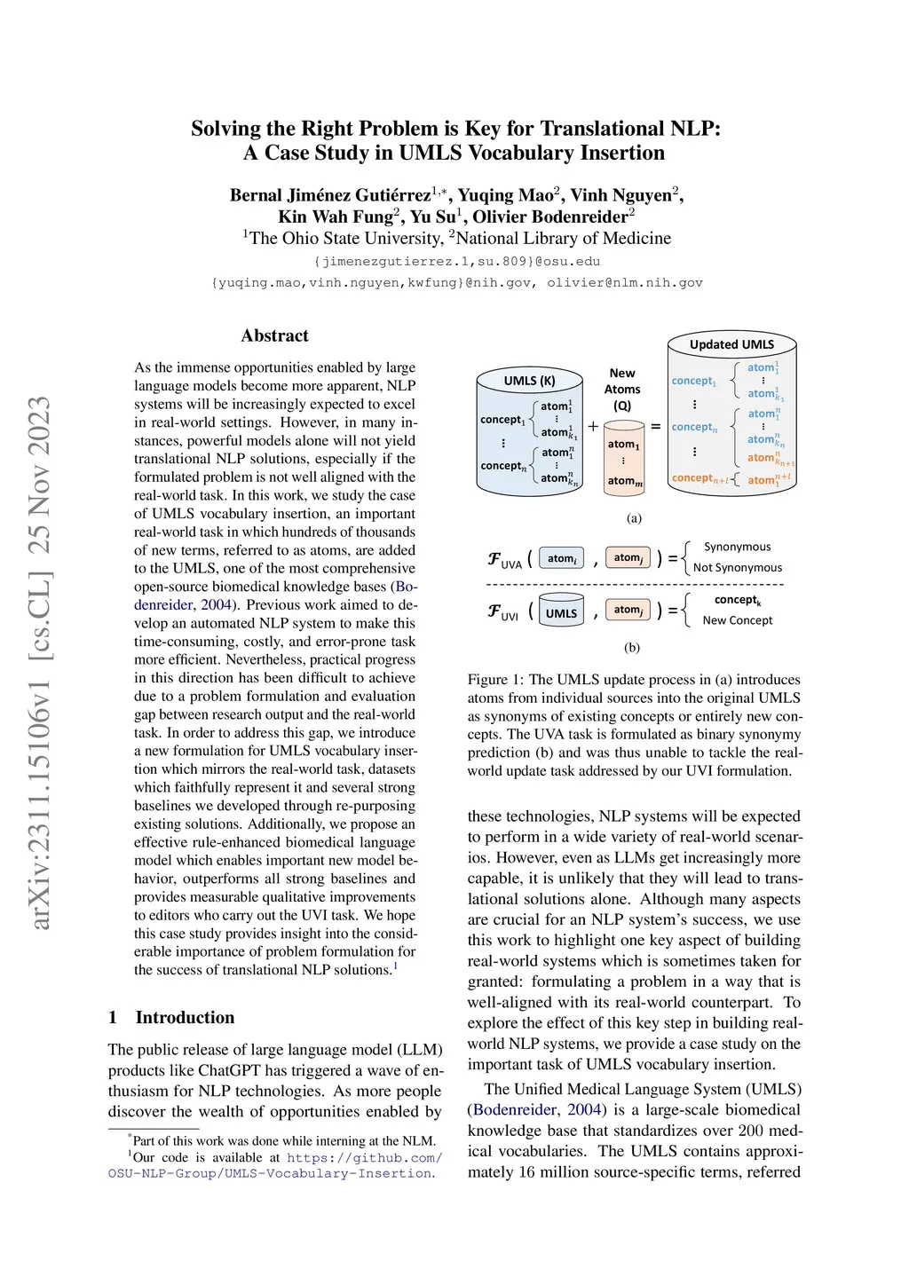 As the immense opportunities enabled by large language models become more apparent, NLP systems will be increasingly expected to excel in real-world settings. However, in many instances, powerful models alone will not yield translational NLP solutions, especially if the formulated problem is not well aligned with the real-world task. In this work, we study the case of UMLS vocabulary insertion, an important real-world task in which hundreds of thousands of new terms, referred to as atoms, are added to the UMLS, one of the most comprehensive open-source biomedical knowledge bases. Previous work aimed to develop an automated NLP system to make this time-consuming, costly, and error-prone task more efficient. Nevertheless, practical progress in this direction has been difficult to achieve due to a problem formulation and evaluation gap between research output and the real-world task. In order to address this gap, we introduce a new formulation for UMLS vocabulary insertion which mirrors the real-world task, datasets which faithfully represent it and several strong baselines we developed through re-purposing existing solutions. Additionally, we propose an effective rule-enhanced biomedical language model which enables important new model behavior, outperforms all strong baselines and provides measurable qualitative improvements to editors who carry out the UVI task. We hope this case study provides insight into the considerable importance of problem formulation for the success of translational NLP solutions.