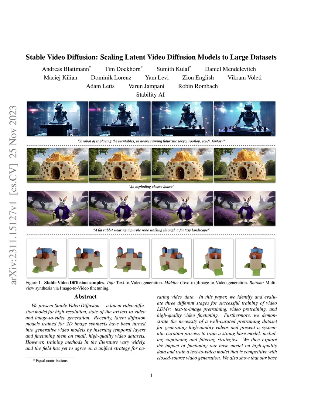 Stable Video Diffusion: Scaling Latent Video Diffusion Models to Large