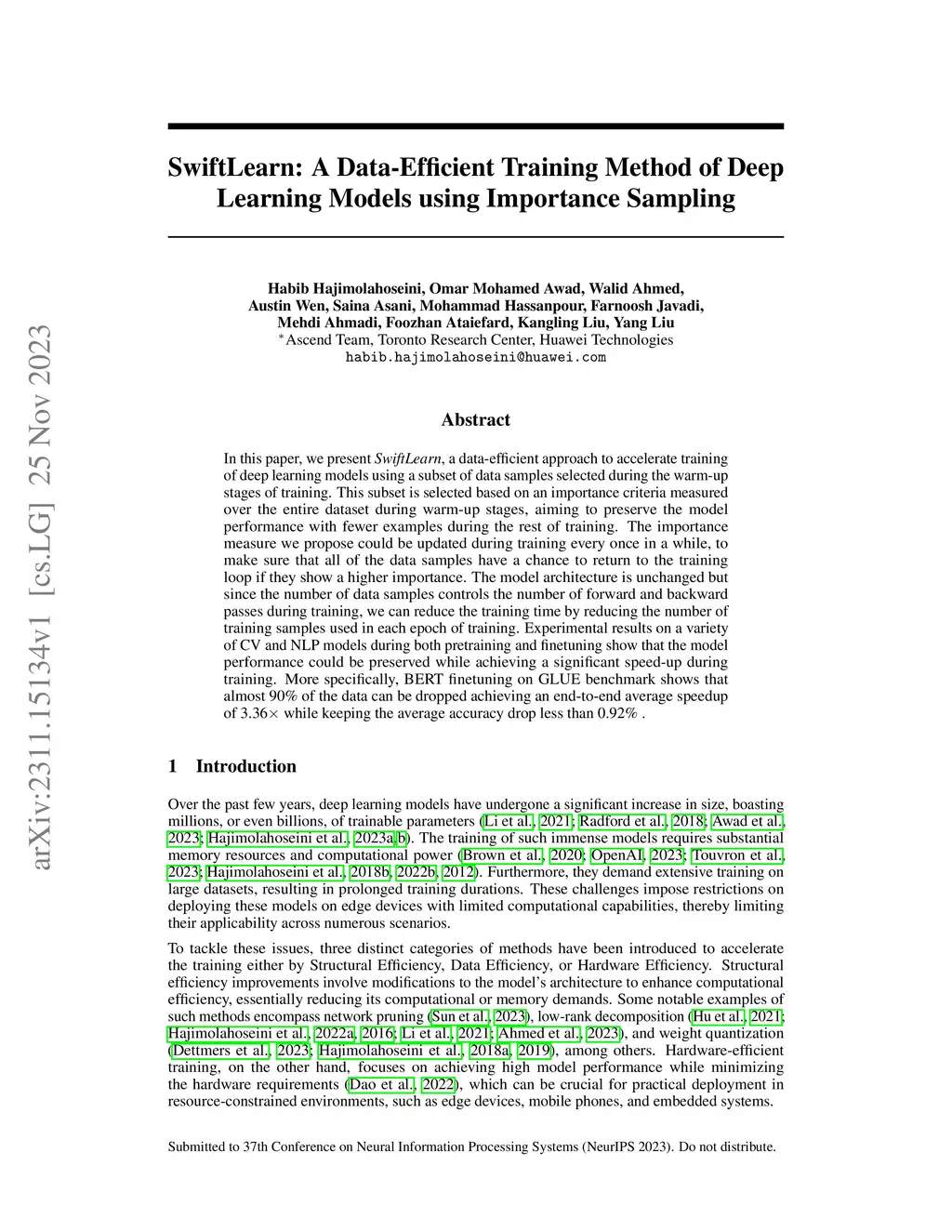 In this paper, we present SwiftLearn, a data-efficient approach to accelerate training of deep learning models using a subset of data samples selected during the warm-up stages of training. This subset is selected based on an importance criteria measured over the entire dataset during warm-up stages, aiming to preserve the model performance with fewer examples during the rest of training. The importance measure we propose could be updated during training every once in a while, to make sure that all of the data samples have a chance to return to the training loop if they show a higher importance. The model architecture is unchanged but since the number of data samples controls the number of forward and backward passes during training, we can reduce the training time by reducing the number of training samples used in each epoch of training. Experimental results on a variety of CV and NLP models during both pretraining and finetuning show that the model performance could be preserved while achieving a significant speed-up during training. More specifically, BERT finetuning on GLUE benchmark shows that almost 90% of the data can be dropped achieving an end-to-end average speedup of 3.36x while keeping the average accuracy drop less than 0.92%.