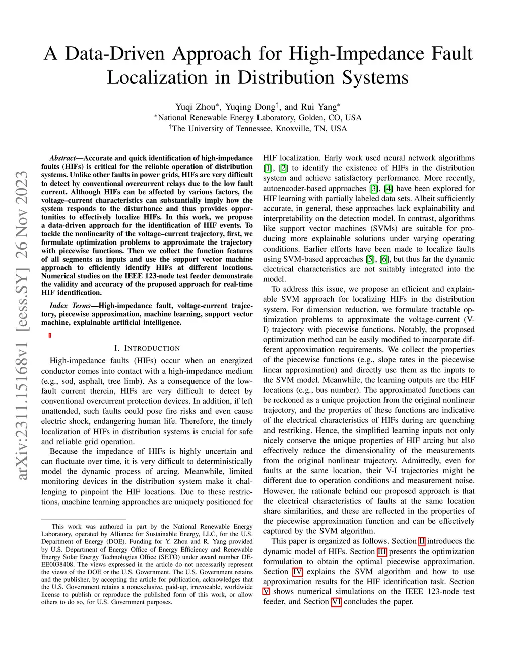 Accurate and quick identification of high-impedance faults is critical for the reliable operation of distribution systems. Unlike other faults in power grids, HIFs are very difficult to detect by conventional overcurrent relays due to the low fault current. Although HIFs can be affected by various factors, the voltage current characteristics can substantially imply how the system responds to the disturbance and thus provides opportunities to effectively localize HIFs. In this work, we propose a data-driven approach for the identification of HIF events. To tackle the nonlinearity of the voltage current trajectory, first, we formulate optimization problems to approximate the trajectory with piecewise functions. Then we collect the function features of all segments as inputs and use the support vector machine approach to efficiently identify HIFs at different locations. Numerical studies on the IEEE 123-node test feeder demonstrate the validity and accuracy of the proposed approach for real-time HIF identification.