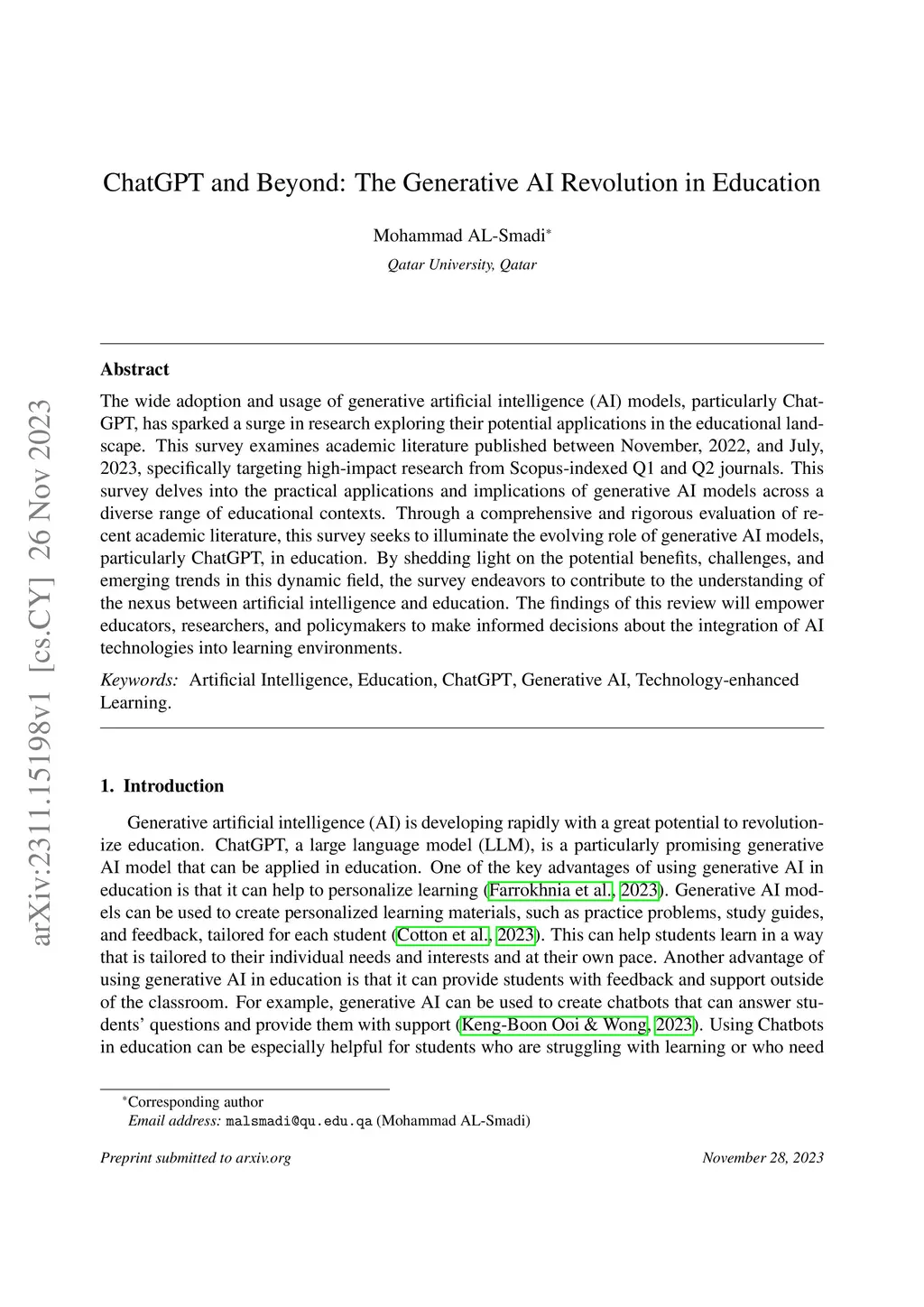 The wide adoption and usage of generative artificial intelligence (AI) models, particularly ChatGPT, has sparked a surge in research exploring their potential applications in the educational landscape. This survey examines academic literature published between November, 2022, and July, 2023, specifically targeting high-impact research from Scopus-indexed Q1 and Q2 journals. This survey delves into the practical applications and implications of generative AI models across a diverse range of educational contexts. Through a comprehensive and rigorous evaluation of recent academic literature, this survey seeks to illuminate the evolving role of generative AI models, particularly ChatGPT, in education. By shedding light on the potential benefits, challenges, and emerging trends in this dynamic field, the survey endeavors to contribute to the understanding of the nexus between artificial intelligence and education. The findings of this review will empower educators, researchers, and policymakers to make informed decisions about the integration of AI technologies into learning environments.