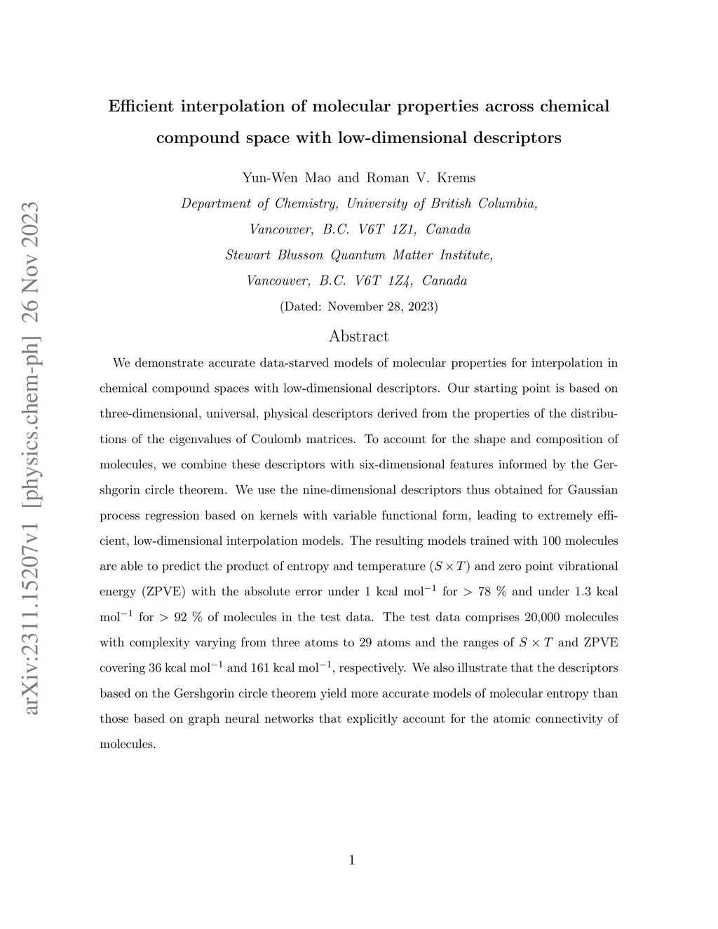 We demonstrate accurate data-starved models of molecular properties for interpolation in chemical compound spaces with low-dimensional descriptors. Our starting point is based on three-dimensional, universal, physical descriptors derived from the properties of the distributions of the eigenvalues of Coulomb matrices. To account for the shape and composition of molecules, we combine these descriptors with six-dimensional features informed by the Gershgorin circle theorem. We use the nine-dimensional descriptors thus obtained for Gaussian process regression based on kernels with variable functional form, leading to extremely efficient, low-dimensional interpolation models. The resulting models trained with 100 molecules are able to predict the product of entropy and temperature () and zero point vibrational energy (ZPVE) with the absolute error under 1 kcal mol for \% and under 1.3 kcal mol for \% of molecules in the test data. The test data comprises 20,000 molecules with complexity varying from three atoms to 29 atoms and the ranges of and ZPVE covering 36 kcal mol and 161 kcal mol, respectively. We also illustrate that the descriptors based on the Gershgorin circle theorem yield more accurate models of molecular entropy than those based on graph neural networks that explicitly account for the atomic connectivity of molecules.