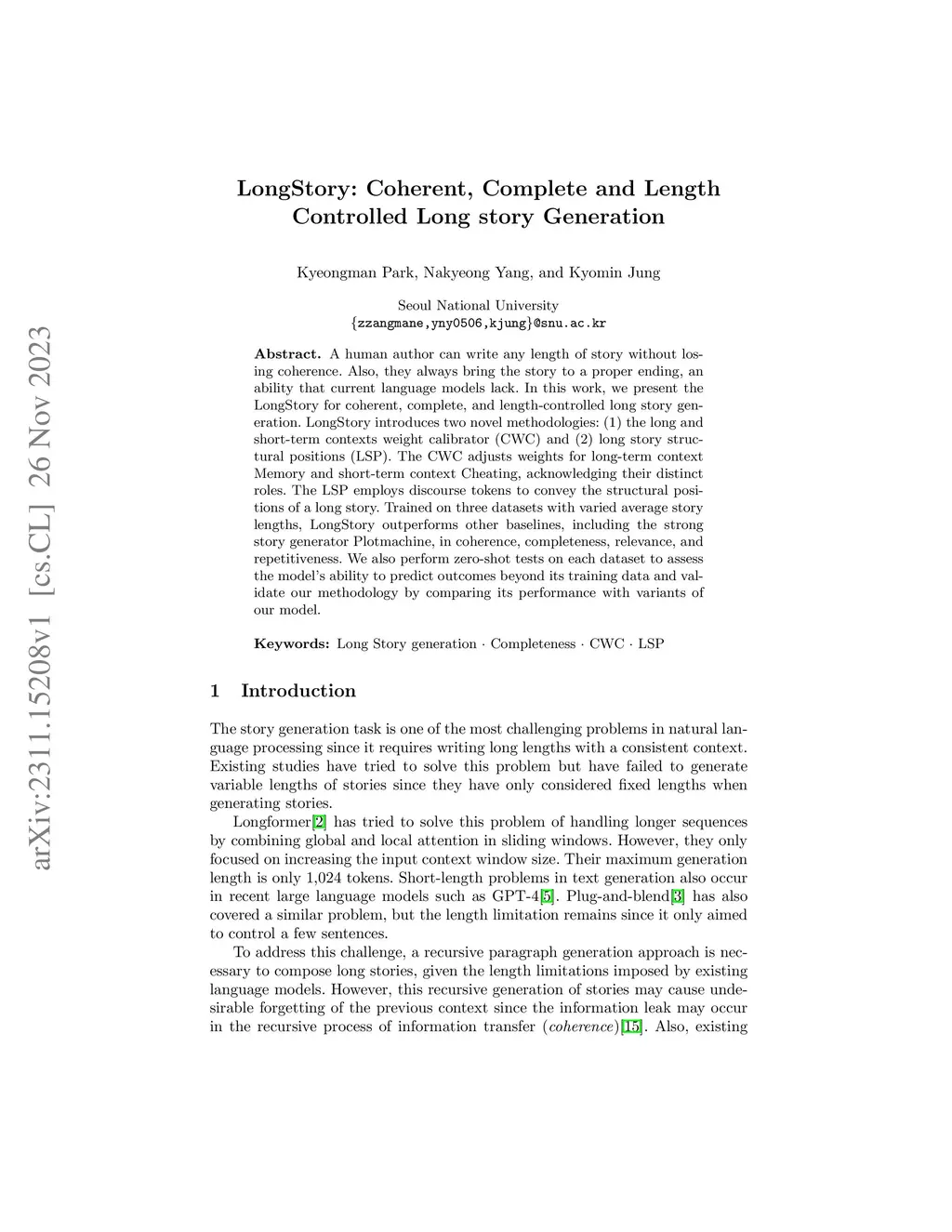 A human author can write any length of story without losing coherence. Also, they always bring the story to a proper ending, an ability that current language models lack. In this work, we present the LongStory for coherent, complete, and length-controlled long story generation. LongStory introduces two novel methodologies: (1) the long and short-term contexts weight calibrator (CWC) and (2) long story structural positions (LSP). The CWC adjusts weights for long-term context Memory and short-term context Cheating, acknowledging their distinct roles. The LSP employs discourse tokens to convey the structural positions of a long story. Trained on three datasets with varied average story lengths, LongStory outperforms other baselines, including the strong story generator Plotmachine, in coherence, completeness, relevance, and repetitiveness. We also perform zero-shot tests on each dataset to assess the model's ability to predict outcomes beyond its training data and validate our methodology by comparing its performance with variants of our model.