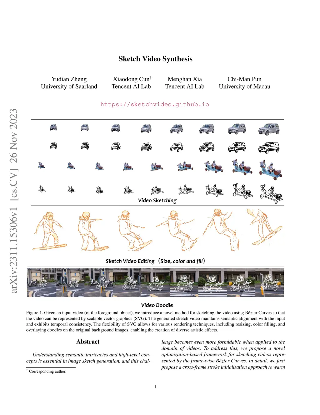 Understanding semantic intricacies and high-level concepts is essential in image sketch generation, and this challenge becomes even more formidable when applied to the domain of videos. To address this, we propose a novel optimization-based framework for sketching videos represented by the frame-wise B\ézier curve. In detail, we first propose a cross-frame stroke initialization approach to warm up the location and the width of each curve. Then, we optimize the locations of these curves by utilizing a semantic loss based on CLIP features and a newly designed consistency loss using the self-decomposed 2D atlas network. Built upon these design elements, the resulting sketch video showcases impressive visual abstraction and temporal coherence. Furthermore, by transforming a video into SVG lines through the sketching process, our method unlocks applications in sketch-based video editing and video doodling, enabled through video composition, as exemplified in the teaser.
