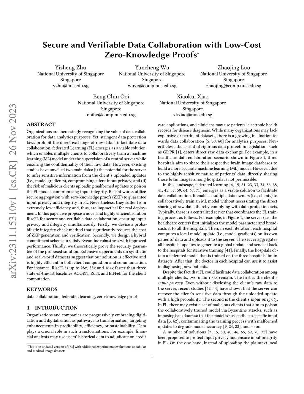 Organizations are increasingly recognizing the value of data collaboration for data analytics purposes. Yet, stringent data protection laws prohibit the direct exchange of raw data. To facilitate data collaboration, federated Learning (FL) emerges as a viable solution, which enables multiple clients to collaboratively train a machine learning (ML) model under the supervision of a central server while ensuring the confidentiality of their raw data. However, existing studies have unveiled two main risks: (i) the potential for the server to infer sensitive information from the client's uploaded updates (i.e., model gradients), compromising client input privacy, and (ii) the risk of malicious clients uploading malformed updates to poison the FL model, compromising input integrity. Recent works utilize secure aggregation with zero-knowledge proofs (ZKP) to guarantee input privacy and integrity in FL. Nevertheless, they suffer from extremely low efficiency and, thus, are impractical for real deployment. In this paper, we propose a novel and highly efficient solution RiseFL for secure and verifiable data collaboration, ensuring input privacy and integrity simultaneously.Firstly, we devise a probabilistic integrity check method that significantly reduces the cost of ZKP generation and verification. Secondly, we design a hybrid commitment scheme to satisfy Byzantine robustness with improved performance. Thirdly, we theoretically prove the security guarantee of the proposed solution. Extensive experiments on synthetic and real-world datasets suggest that our solution is effective and is highly efficient in both client computation and communication. For instance, RiseFL is up to 28x, 53x and 164x faster than three state-of-the-art baselines ACORN, RoFL and EIFFeL for the client computation.