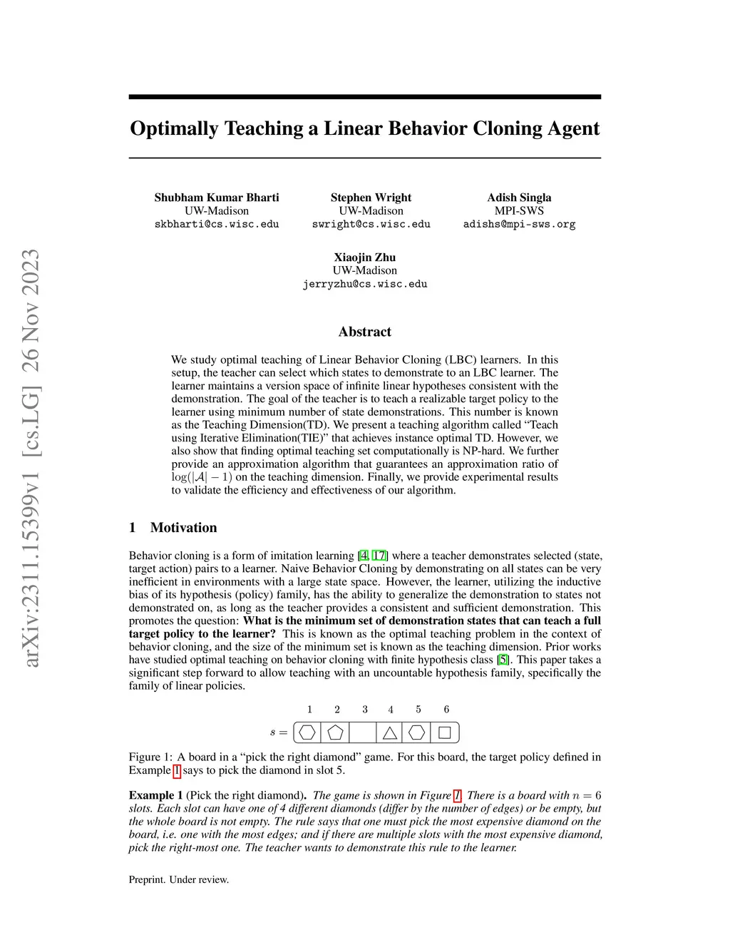 We study optimal teaching of Linear Behavior Cloning (LBC) learners. In this setup, the teacher can select which states to demonstrate to an LBC learner. The learner maintains a version space of infinite linear hypotheses consistent with the demonstration. The goal of the teacher is to teach a realizable target policy to the learner using minimum number of state demonstrations. This number is known as the Teaching Dimension(TD). We present a teaching algorithm called ``Teach using Iterative Elimination(TIE)" that achieves instance optimal TD. However, we also show that finding optimal teaching set computationally is NP-hard. We further provide an approximation algorithm that guarantees an approximation ratio of on the teaching dimension. Finally, we provide experimental results to validate the efficiency and effectiveness of our algorithm.