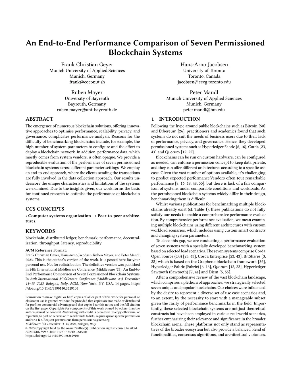 The emergence of more and more blockchain solutions with innovative approaches to optimising performance, scalability, privacy and governance complicates performance analysis. Reasons for the difficulty of benchmarking blockchains include, for example, the high number of system parameters to configure and the effort to deploy a blockchain network. In addition, performance data, which mostly comes from system vendors, is often intransparent. We investigate and evaluate the performance of seven permissioned blockchain systems using different parameter settings in a reproducible manner. We employ an end-to-end approach, where the clients sending the transactions are fully involved in the data collection approach. Our results highlight the peculiarities and limitations of the systems under investigation. Due to the insights given, our work forms the basis for continued research to optimise the performance of blockchain systems.