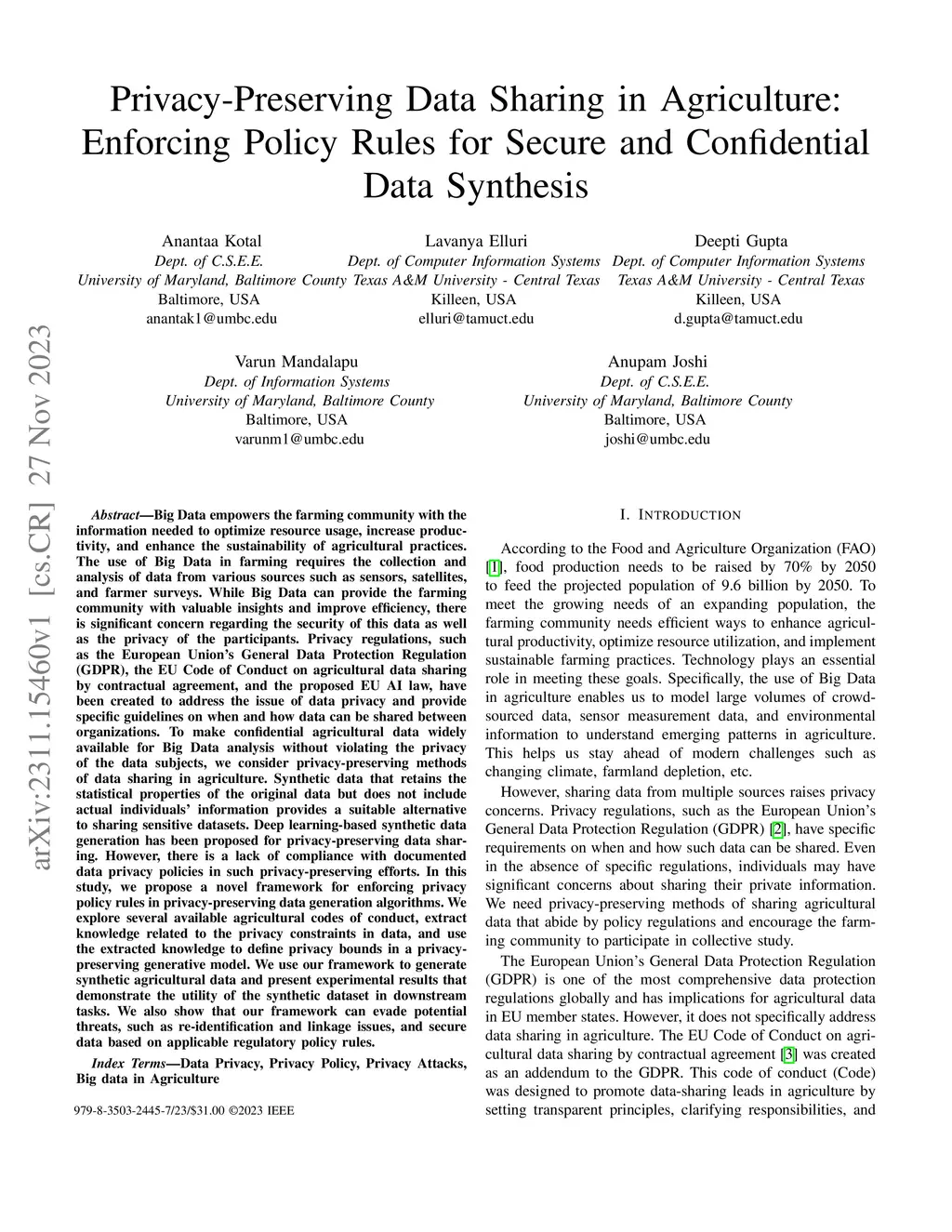 Privacy-Preserving Data Sharing in Agriculture: Enforcing Policy Rules