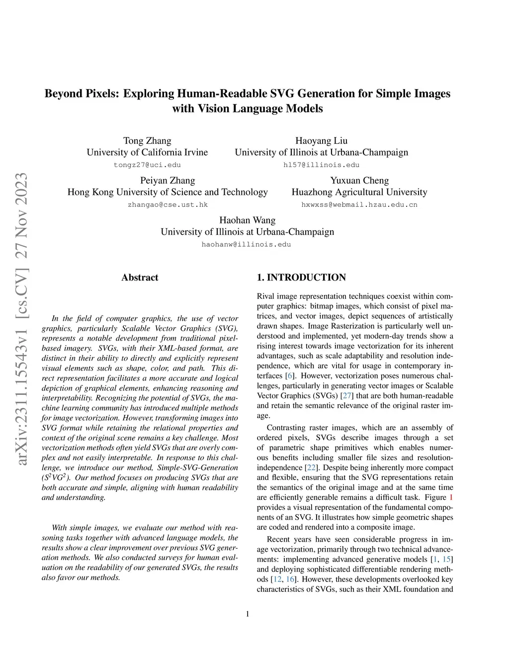 In the field of computer graphics, the use of vector graphics, particularly Scalable Vector Graphics (SVG), represents a notable development from traditional pixel-based imagery. SVGs, with their XML-based format, are distinct in their ability to directly and explicitly represent visual elements such as shape, color, and path. This direct representation facilitates a more accurate and logical depiction of graphical elements, enhancing reasoning and interpretability. Recognizing the potential of SVGs, the machine learning community has introduced multiple methods for image vectorization. However, transforming images into SVG format while retaining the relational properties and context of the original scene remains a key challenge. Most vectorization methods often yield SVGs that are overly complex and not easily interpretable. In response to this challenge, we introduce our method, Simple-SVG-Generation (S\textsuperscript{2}VG\textsuperscript{2}). Our method focuses on producing SVGs that are both accurate and simple, aligning with human readability and understanding. With simple images, we evaluate our method with reasoning tasks together with advanced language models, the results show a clear improvement over previous SVG generation methods. We also conducted surveys for human evaluation on the readability of our generated SVGs, the results also favor our methods.