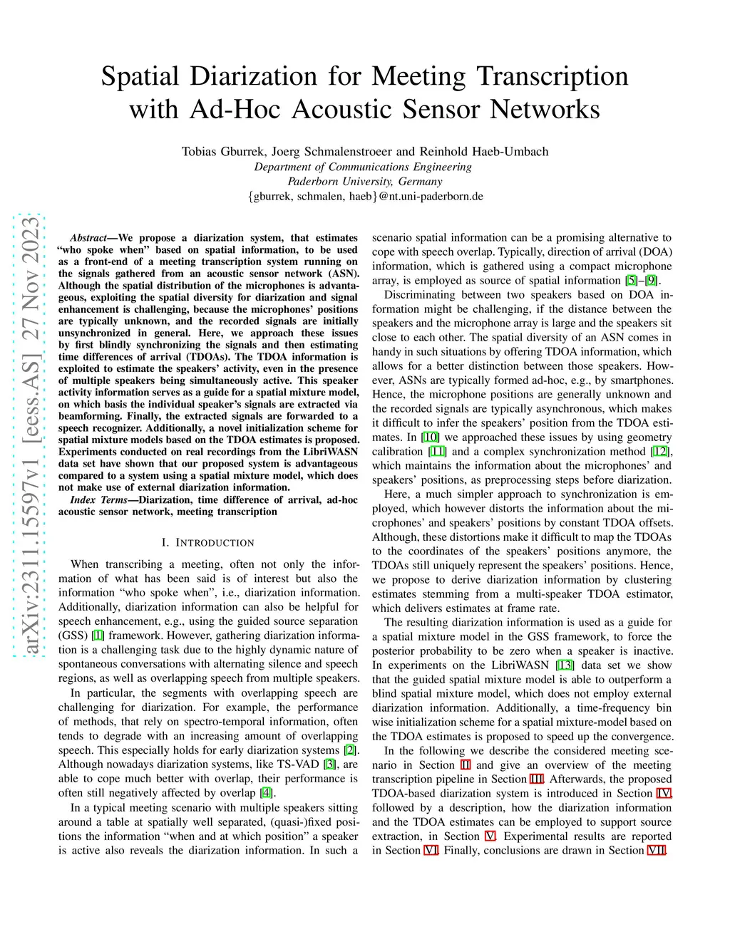 We propose a diarization system, that estimates "who spoke when" based on spatial information, to be used as a front-end of a meeting transcription system running on the signals gathered from an acoustic sensor network (ASN). Although the spatial distribution of the microphones is advantageous, exploiting the spatial diversity for diarization and signal enhancement is challenging, because the microphones' positions are typically unknown, and the recorded signals are initially unsynchronized in general. Here, we approach these issues by first blindly synchronizing the signals and then estimating time differences of arrival (TDOAs). The TDOA information is exploited to estimate the speakers' activity, even in the presence of multiple speakers being simultaneously active. This speaker activity information serves as a guide for a spatial mixture model, on which basis the individual speaker's signals are extracted via beamforming. Finally, the extracted signals are forwarded to a speech recognizer. Additionally, a novel initialization scheme for spatial mixture models based on the TDOA estimates is proposed. Experiments conducted on real recordings from the LibriWASN data set have shown that our proposed system is advantageous compared to a system using a spatial mixture model, which does not make use of external diarization information.