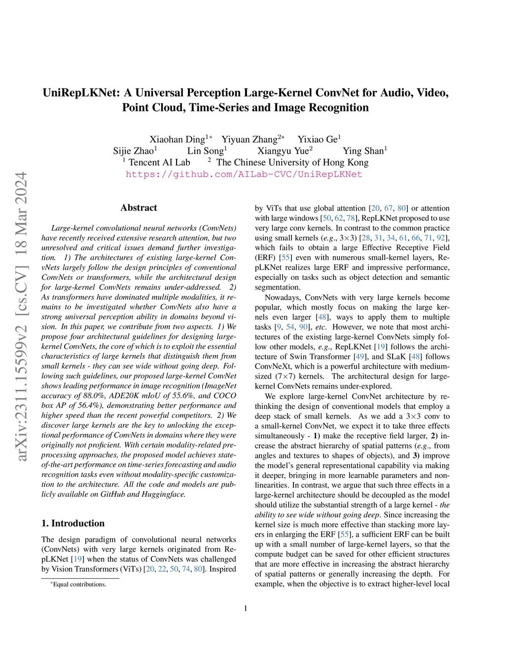 Large-kernel convolutional neural networks (ConvNets) have recently received extensive research attention, but two unresolved and critical issues demand further investigation. 1) The architectures of existing large-kernel ConvNets largely follow the design principles of conventional ConvNets or transformers, while the architectural design for large-kernel ConvNets remains under-addressed. 2) As transformers have dominated multiple modalities, it remains to be investigated whether ConvNets also have a strong universal perception ability in domains beyond vision. In this paper, we contribute from two aspects. 1) We propose four architectural guidelines for designing large-kernel ConvNets, the core of which is to exploit the essential characteristics of large kernels that distinguish them from small kernels - they can see wide without going deep. Following such guidelines, our proposed large-kernel ConvNet shows leading performance in image recognition (ImageNet accuracy of 88.0%, ADE20K mIoU of 55.6%, and COCO box AP of 56.4%), demonstrating better performance and higher speed than the recent powerful competitors. 2) We discover large kernels are the key to unlocking the exceptional performance of ConvNets in domains where they were originally not proficient. With certain modality-related preprocessing approaches, the proposed model achieves state-of-the-art performance on time-series forecasting and audio recognition tasks even without modality-specific customization to the architecture. All the code and models are publicly available on GitHub and Huggingface.