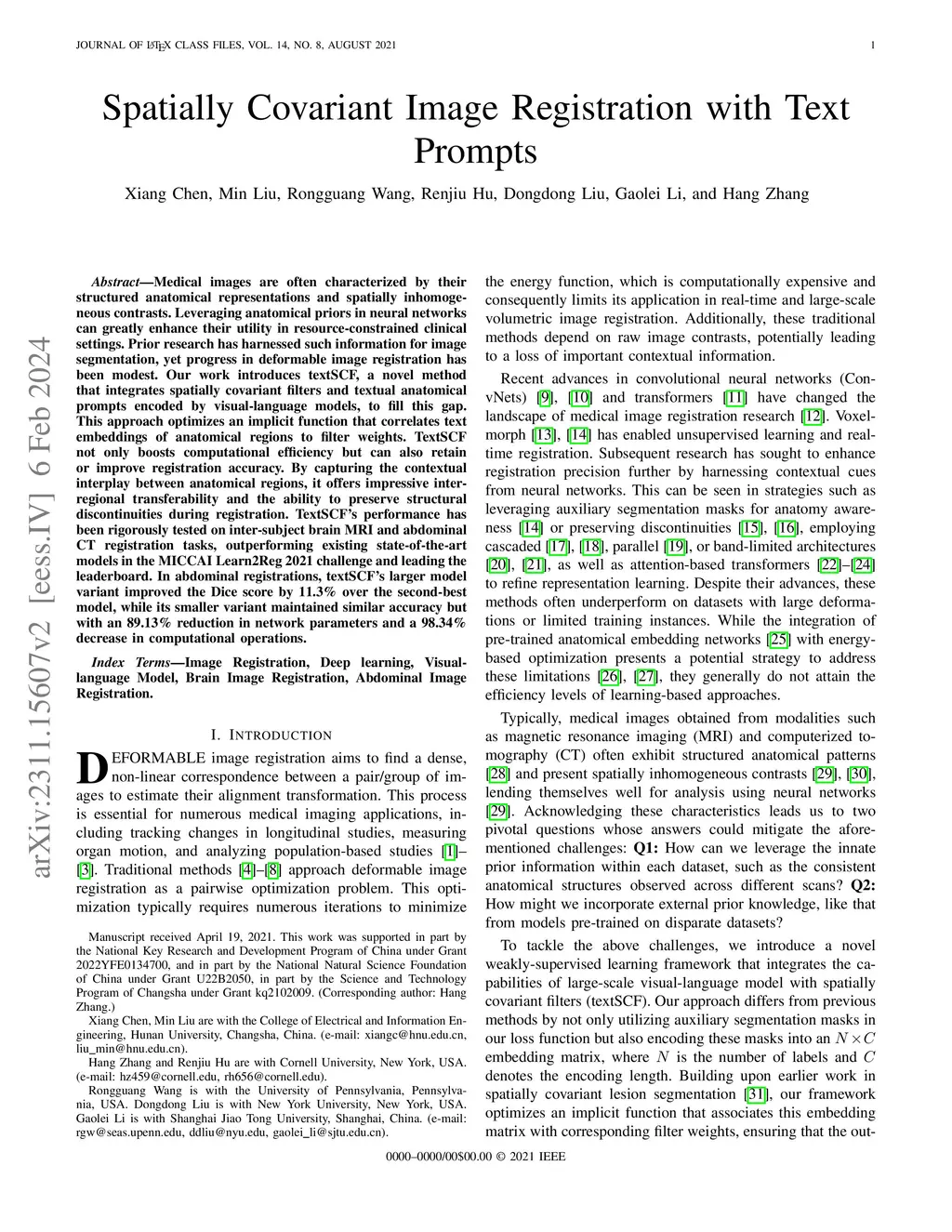 Medical images are often characterized by their structured anatomical representations and spatially inhomogeneous contrasts. Leveraging anatomical priors in neural networks can greatly enhance their utility in resource-constrained clinical settings. Prior research has harnessed such information for image segmentation, yet progress in deformable image registration has been modest. Our work introduces textSCF, a novel method that integrates spatially covariant filters and textual anatomical prompts encoded by visual-language models, to fill this gap. This approach optimizes an implicit function that correlates text embeddings of anatomical regions to filter weights, relaxing the typical translation-invariance constraint of convolutional operations. TextSCF not only boosts computational efficiency but can also retain or improve registration accuracy. By capturing the contextual interplay between anatomical regions, it offers impressive inter-regional transferability and the ability to preserve structural discontinuities during registration. TextSCF's performance has been rigorously tested on inter-subject brain MRI and abdominal CT registration tasks, outperforming existing state-of-the-art models in the MICCAI Learn2Reg 2021 challenge and leading the leaderboard. In abdominal registrations, textSCF's larger model variant improved the Dice score by 11.3% over the second-best model, while its smaller variant maintained similar accuracy but with an 89.13% reduction in network parameters and a 98.34\% decrease in computational operations.
