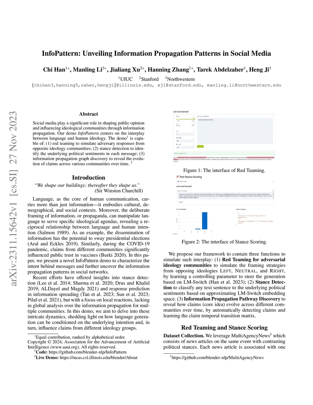 Social media play a significant role in shaping public opinion and influencing ideological communities through information propagation. Our demo InfoPattern centers on the interplay between language and human ideology. The demo (Code: https://github.com/blender-nlp/InfoPattern ) is capable of: (1) red teaming to simulate adversary responses from opposite ideology communities; (2) stance detection to identify the underlying political sentiments in each message; (3) information propagation graph discovery to reveal the evolution of claims across various communities over time. (Live Demo: https://incas.csl.illinois.edu/blender/About )