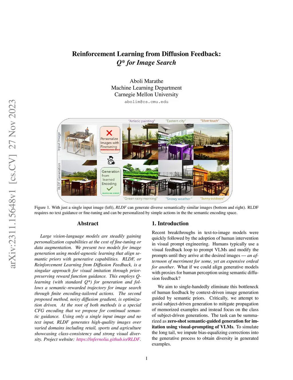 Large vision-language models are steadily gaining personalization capabilities at the cost of fine-tuning or data augmentation. We present two models for image generation using model-agnostic learning that align semantic priors with generative capabilities. RLDF, or Reinforcement Learning from Diffusion Feedback, is a singular approach for visual imitation through prior-preserving reward function guidance. This employs Q-learning (with standard Q*) for generation and follows a semantic-rewarded trajectory for image search through finite encoding-tailored actions. The second proposed method, noisy diffusion gradient, is optimization driven. At the root of both methods is a special CFG encoding that we propose for continual semantic guidance. Using only a single input image and no text input, RLDF generates high-quality images over varied domains including retail, sports and agriculture showcasing class-consistency and strong visual diversity. Project website is available at https://infernolia.github.io/RLDF.