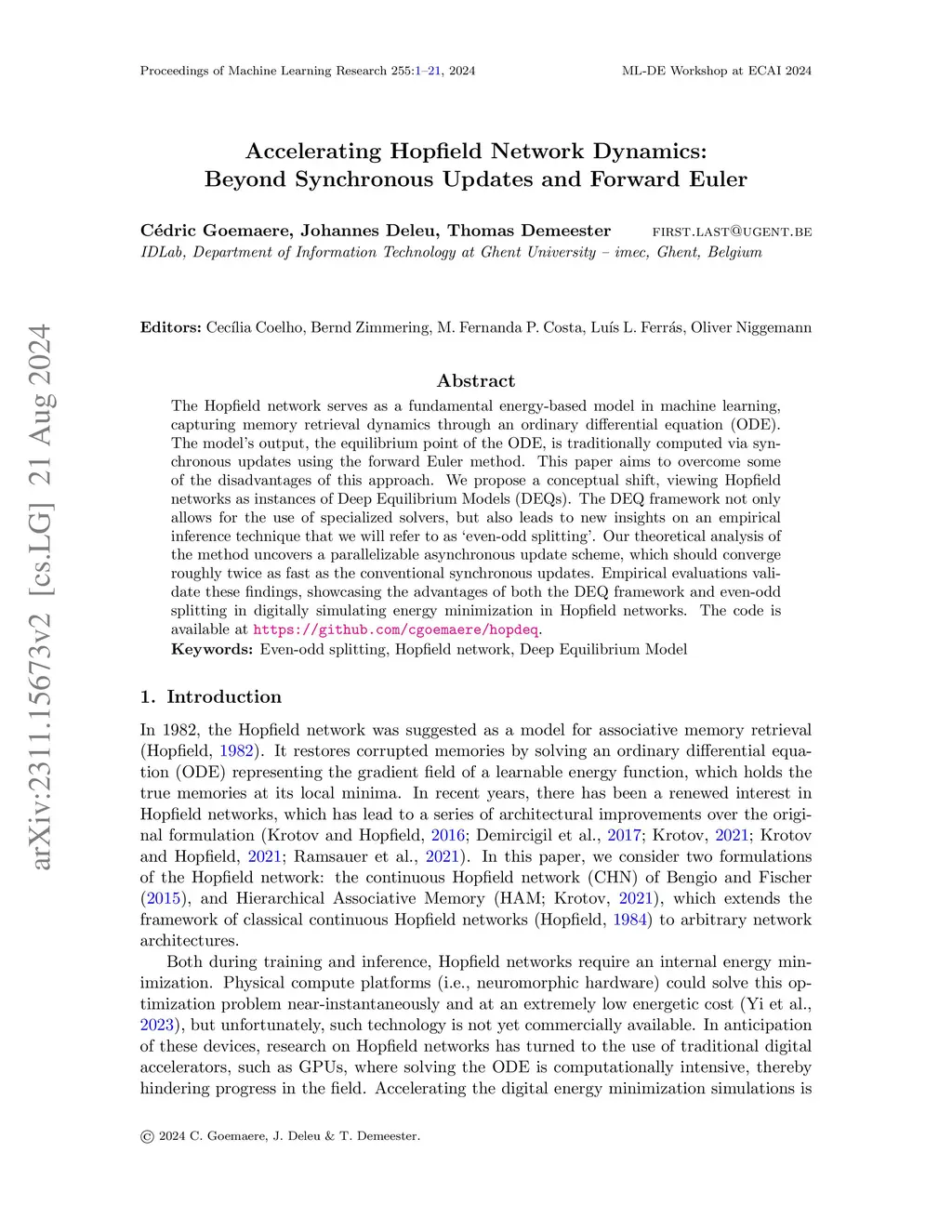 Hierarchical Associative Memory models have recently been proposed as a versatile extension of continuous Hopfield networks. In order to facilitate future research on such models, especially at scale, we focus on increasing their simulation efficiency on digital hardware. In particular, we propose two strategies to speed up memory retrieval in these models, which corresponds to their use at inference, but is equally important during training. First, we show how they can be cast as Deep Equilibrium Models, which allows using faster and more stable solvers. Second, inspired by earlier work, we show that alternating optimization of the even and odd layers accelerates memory retrieval by a factor close to two. Combined, these two techniques allow for a much faster energy minimization, as shown in our proof-of-concept experimental results. The code is available at https://github.com/cgoemaere/hamdeq