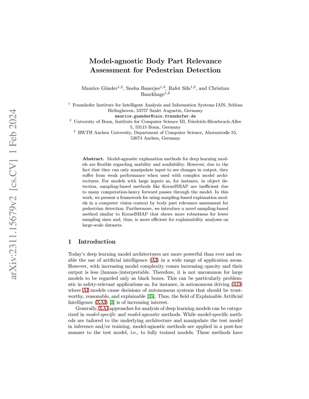 Model-agnostic explanation methods for deep learning models are flexible regarding usability and availability. However, due to the fact that they can only manipulate input to see changes in output, they suffer from weak performance when used with complex model architectures. For models with large inputs as, for instance, in object detection, sampling-based methods like KernelSHAP are inefficient due to many computation-heavy forward passes through the model. In this work, we present a framework for using sampling-based explanation models in a computer vision context by body part relevance assessment for pedestrian detection. Furthermore, we introduce a novel sampling-based method similar to KernelSHAP that shows more robustness for lower sampling sizes and, thus, is more efficient for explainability analyses on large-scale datasets.