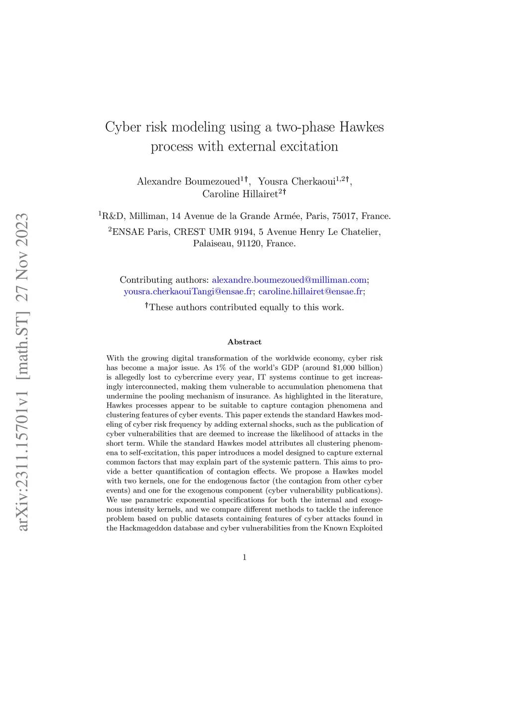 With the growing digital transformation of the worldwide economy, cyber risk has become a major issue. As 1 % of the world's GDP (around $1,000 billion) is allegedly lost to cybercrime every year, IT systems continue to get increasingly interconnected, making them vulnerable to accumulation phenomena that undermine the pooling mechanism of insurance. As highlighted in the literature, Hawkes processes appear to be suitable models to capture contagion phenomena and clustering features of cyber events. This paper extends the standard Hawkes modeling of cyber risk frequency by adding external shocks, modelled by the publication of cyber vulnerabilities that are deemed to increase the likelihood of attacks in the short term. The aim of the proposed model is to provide a better quantification of contagion effects since, while the standard Hawkes model allocates all the clustering phenomena to self-excitation, our model allows to capture the external common factors that may explain part of the systemic pattern. We propose a Hawkes model with two kernels, one for the endogenous factor (the contagion from other cyber events) and one for the exogenous component (cyber vulnerability publications). We use parametric exponential specifications for both the internal and exogenous intensity kernels, and we compare different methods to tackle the inference problem based on public datasets containing features of cyber attacks found in the Hackmageddon database and cyber vulnerabilities from the Known Exploited Vulnerability database and the National Vulnerability Dataset. By refining the external excitation database selection, the degree of endogeneity of the model is nearly halved. We illustrate our model with simulations and discuss the impact of taking into account the external factor driven by vulnerabilities. Once an attack has occurred, response measures are implemented to limit the effects of an attack. These measures include patching vulnerabilities and reducing the attack's contagion. We use an augmented version of the model by adding a second phase modeling a reduction in the contagion pattern from the remediation measures. Based on this model, we explore various scenarios and quantify the effect of mitigation measures of an insurance company that aims to mitigate the effects of a cyber pandemic in its insured portfolio.
