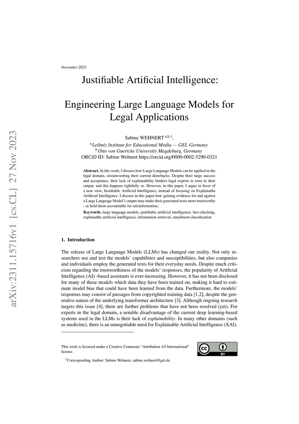 In this work, I discuss how Large Language Models can be applied in the legal domain, circumventing their current drawbacks. Despite their large success and acceptance, their lack of explainability hinders legal experts to trust in their output, and this happens rightfully so. However, in this paper, I argue in favor of a new view, Justifiable Artificial Intelligence, instead of focusing on Explainable Artificial Intelligence. I discuss in this paper how gaining evidence for and against a Large Language Model's output may make their generated texts more trustworthy - or hold them accountable for misinformation.