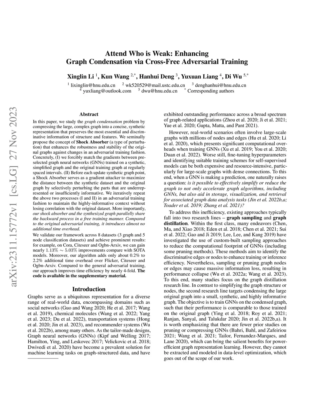 In this paper, we study the \textit{graph condensation} problem by compressing the large, complex graph into a concise, synthetic representation that preserves the most essential and discriminative information of structure and features. We seminally propose the concept of Shock Absorber (a type of perturbation) that enhances the robustness and stability of the original graphs against changes in an adversarial training fashion. Concretely, (I) we forcibly match the gradients between pre-selected graph neural networks (GNNs) trained on a synthetic, simplified graph and the original training graph at regularly spaced intervals. (II) Before each update synthetic graph point, a Shock Absorber serves as a gradient attacker to maximize the distance between the synthetic dataset and the original graph by selectively perturbing the parts that are underrepresented or insufficiently informative. We iteratively repeat the above two processes (I and II) in an adversarial training fashion to maintain the highly-informative context without losing correlation with the original dataset. More importantly, our shock absorber and the synthesized graph parallelly share the backward process in a free training manner. Compared to the original adversarial training, it introduces almost no additional time overhead. We validate our framework across 8 datasets (3 graph and 5 node classification datasets) and achieve prominent results: for example, on Cora, Citeseer and Ogbn-Arxiv, we can gain nearly 1.13% to 5.03% improvements compare with SOTA models. Moreover, our algorithm adds only about 0.2% to 2.2% additional time overhead over Flicker, Citeseer and Ogbn-Arxiv. Compared to the general adversarial training, our approach improves time efficiency by nearly 4-fold.