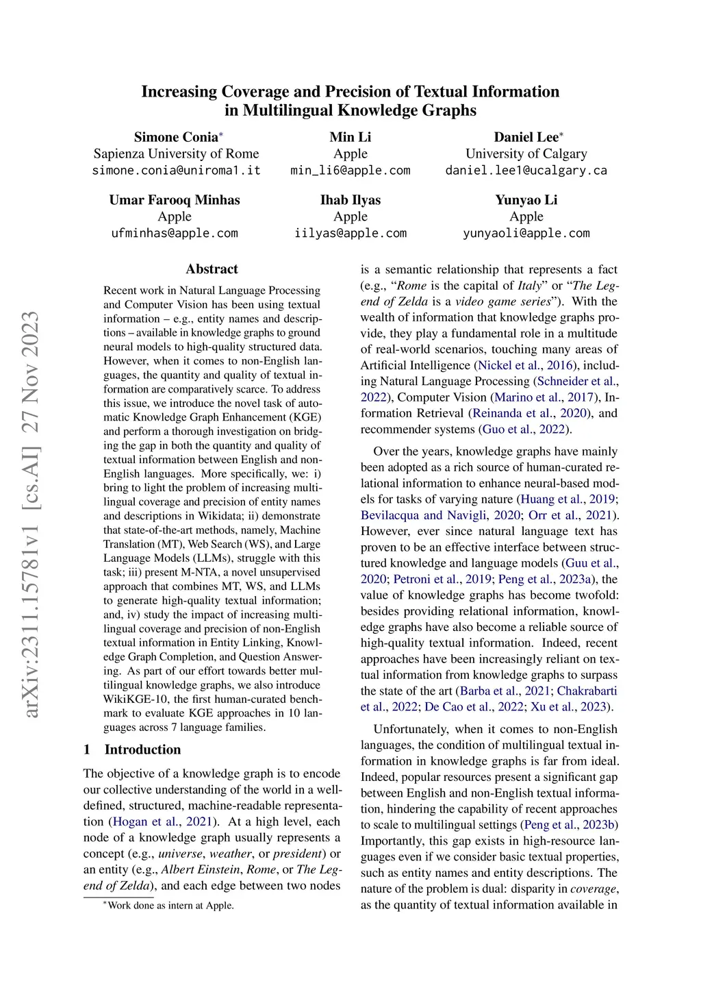 Recent work in Natural Language Processing and Computer Vision has been using textual information -- e.g., entity names and descriptions -- available in knowledge graphs to ground neural models to high-quality structured data. However, when it comes to non-English languages, the quantity and quality of textual information are comparatively scarce. To address this issue, we introduce the novel task of automatic Knowledge Graph Enhancement (KGE) and perform a thorough investigation on bridging the gap in both the quantity and quality of textual information between English and non-English languages. More specifically, we: i) bring to light the problem of increasing multilingual coverage and precision of entity names and descriptions in Wikidata; ii) demonstrate that state-of-the-art methods, namely, Machine Translation (MT), Web Search (WS), and Large Language Models (LLMs), struggle with this task; iii) present M-NTA, a novel unsupervised approach that combines MT, WS, and LLMs to generate high-quality textual information; and, iv) study the impact of increasing multilingual coverage and precision of non-English textual information in Entity Linking, Knowledge Graph Completion, and Question Answering. As part of our effort towards better multilingual knowledge graphs, we also introduce WikiKGE-10, the first human-curated benchmark to evaluate KGE approaches in 10 languages across 7 language families.