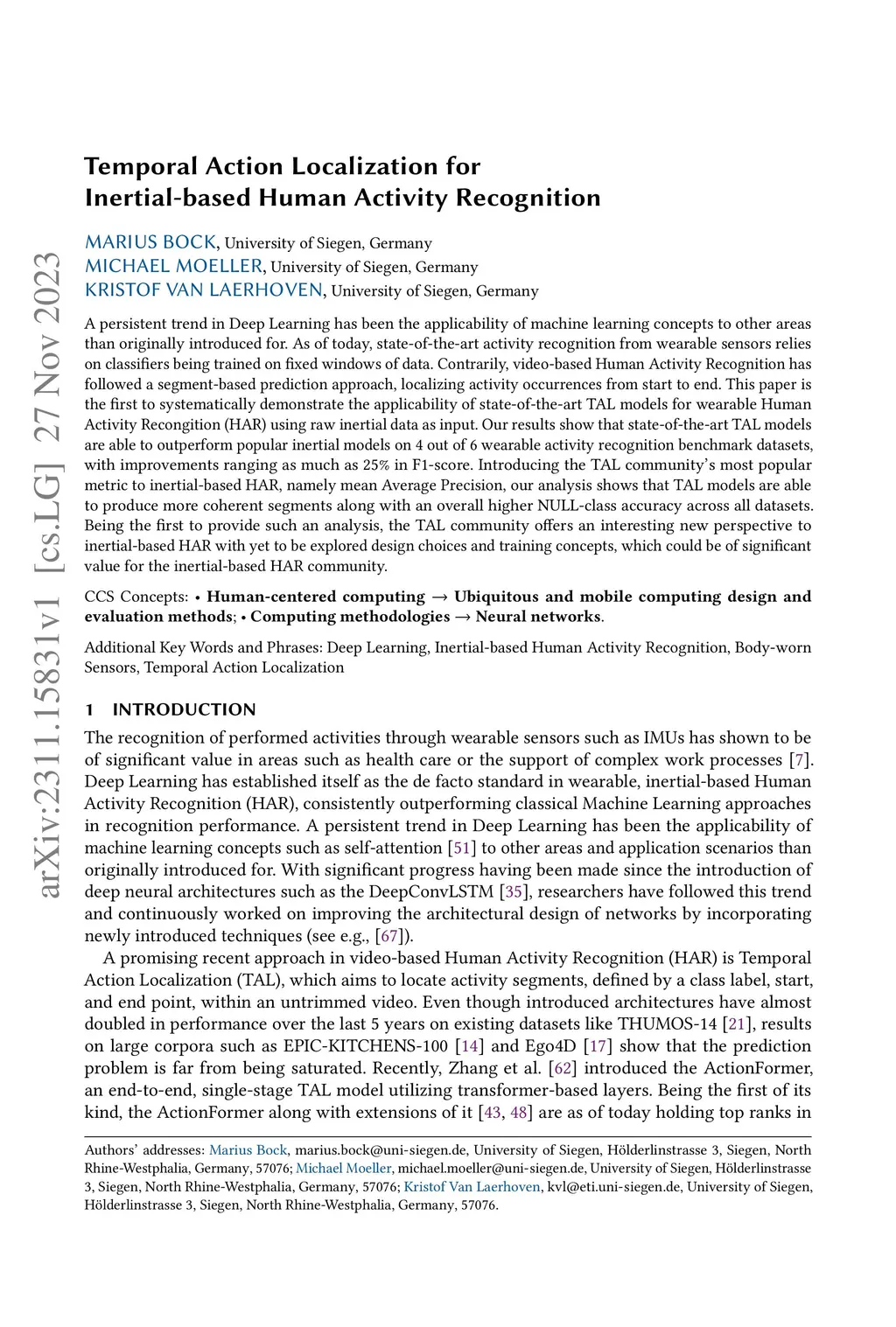 A persistent trend in Deep Learning has been the applicability of machine learning concepts to other areas than originally introduced for. As of today, state-of-the-art activity recognition from wearable sensors relies on classifiers being trained on fixed windows of data. Contrarily, video-based Human Activity Recognition has followed a segment-based prediction approach, localizing activity occurrences from start to end. This paper is the first to systematically demonstrate the applicability of state-of-the-art TAL models for wearable Human Activity Recongition (HAR) using raw inertial data as input. Our results show that state-of-the-art TAL models are able to outperform popular inertial models on 4 out of 6 wearable activity recognition benchmark datasets, with improvements ranging as much as 25% in F1-score. Introducing the TAL community's most popular metric to inertial-based HAR, namely mean Average Precision, our analysis shows that TAL models are able to produce more coherent segments along with an overall higher NULL-class accuracy across all datasets. Being the first to provide such an analysis, the TAL community offers an interesting new perspective to inertial-based HAR with yet to be explored design choices and training concepts, which could be of significant value for the inertial-based HAR community.