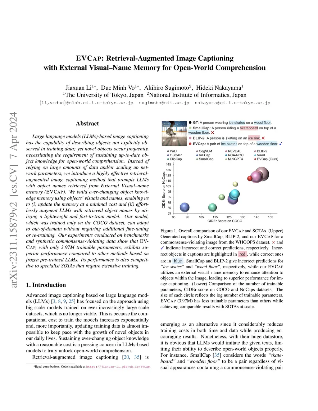 Large language models (LLMs)-based image captioning has the capability of describing objects not explicitly observed in training data; yet novel objects occur frequently, necessitating the requirement of sustaining up-to-date object knowledge for open-world comprehension. Instead of relying on large amounts of data and/or scaling up network parameters, we introduce a highly effective retrieval-augmented image captioning method that prompts LLMs with object names retrieved from External Visual--name memory (EVCap). We build ever-changing object knowledge memory using objects' visuals and names, enabling us to (i) update the memory at a minimal cost and (ii) effortlessly augment LLMs with retrieved object names by utilizing a lightweight and fast-to-train model. Our model, which was trained only on the COCO dataset, can adapt to out-of-domain without requiring additional fine-tuning or re-training. Our experiments conducted on benchmarks and synthetic commonsense-violating data show that EVCap, with only 3.97M trainable parameters, exhibits superior performance compared to other methods based on frozen pre-trained LLMs. Its performance is also competitive to specialist SOTAs that require extensive training.