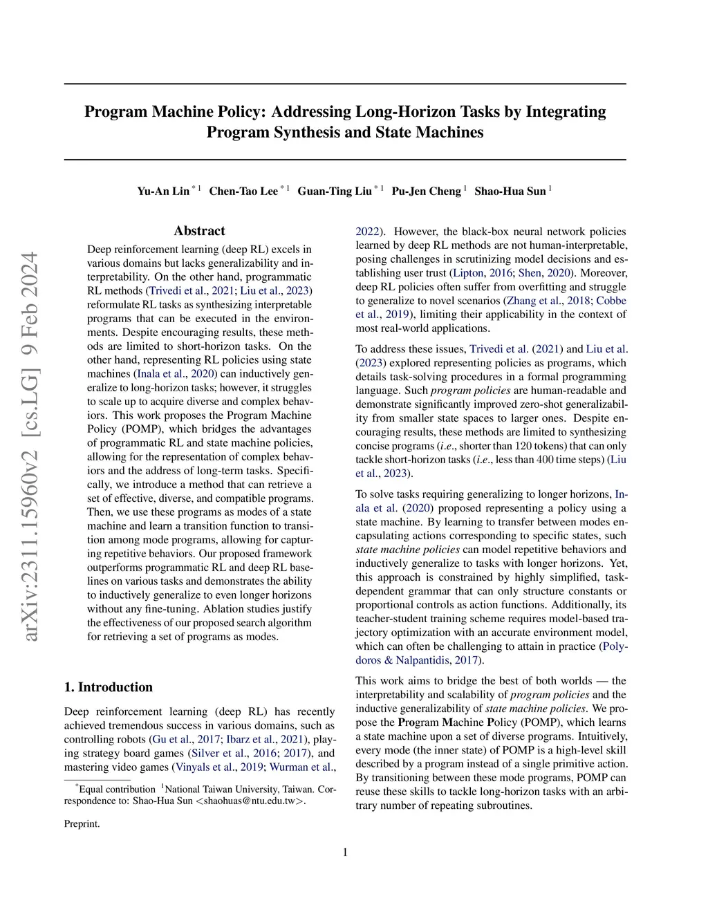 Deep reinforcement learning (deep RL) excels in various domains but lacks generalizability and interpretability. On the other hand, programmatic RL methods (Trivedi et al., 2021; Liu et al., 2023) reformulate RL tasks as synthesizing interpretable programs that can be executed in the environments. Despite encouraging results, these methods are limited to short-horizon tasks. On the other hand, representing RL policies using state machines (Inala et al., 2020) can inductively generalize to long-horizon tasks; however, it struggles to scale up to acquire diverse and complex behaviors. This work proposes the Program Machine Policy (POMP), which bridges the advantages of programmatic RL and state machine policies, allowing for the representation of complex behaviors and the address of long-term tasks. Specifically, we introduce a method that can retrieve a set of effective, diverse, and compatible programs. Then, we use these programs as modes of a state machine and learn a transition function to transition among mode programs, allowing for capturing repetitive behaviors. Our proposed framework outperforms programmatic RL and deep RL baselines on various tasks and demonstrates the ability to inductively generalize to even longer horizons without any fine-tuning. Ablation studies justify the effectiveness of our proposed search algorithm for retrieving a set of programs as modes.